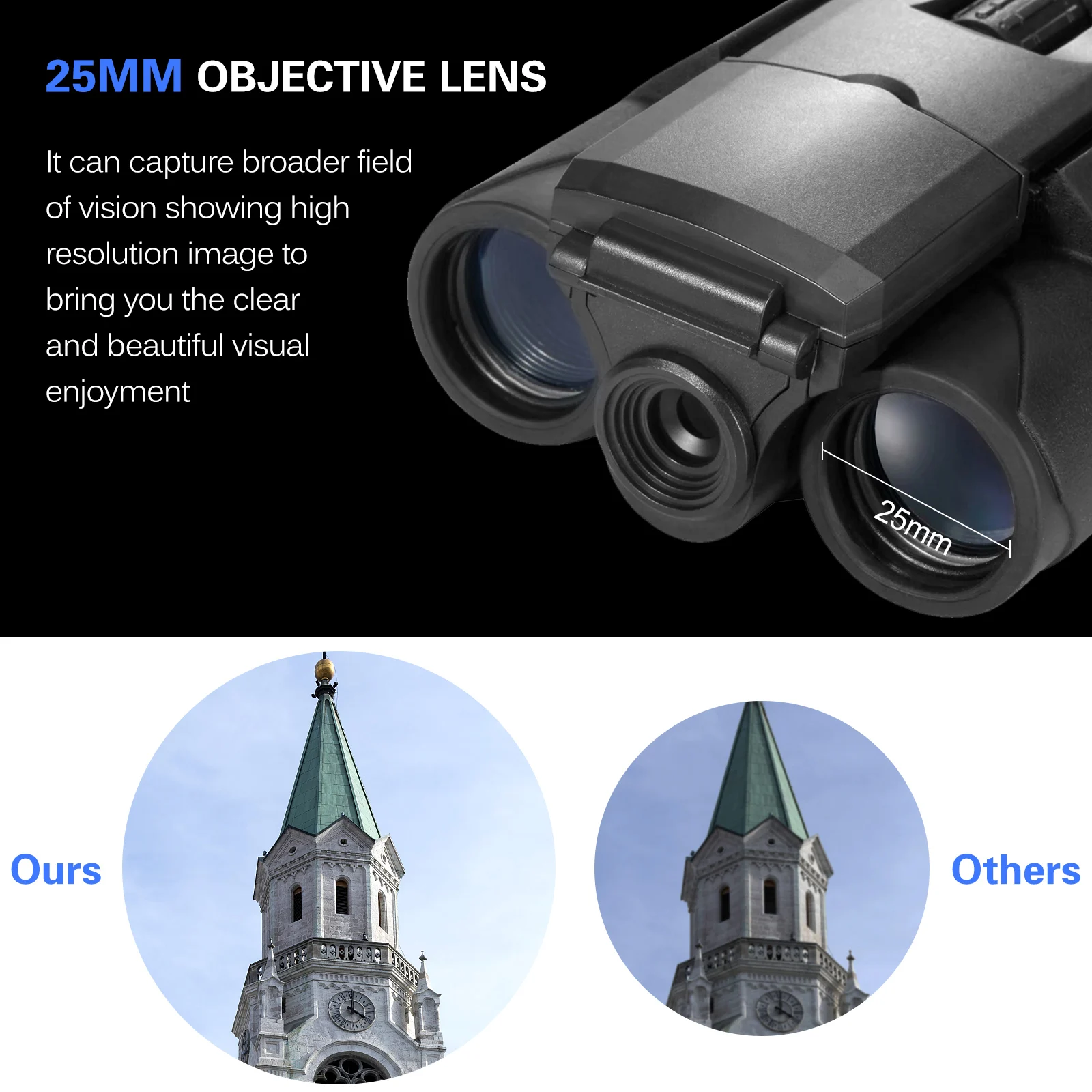 Этот бинокль 10X25 имеет функцию визуализации и записи видео, поэтому он может снимать мгновенные замечательные фотографии, показывающие цифровое изображение высокого разрешения, чтобы предоставить вам четкое и красивое визуальное удовольствие. Отлично подходит для кемпинга на открытом воздухе, наблюдения за птицами, пеших прогулок, спортивных мероприятий и других мероприятий.