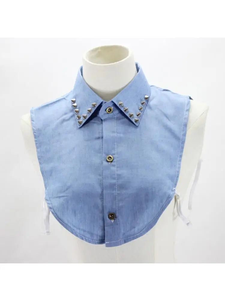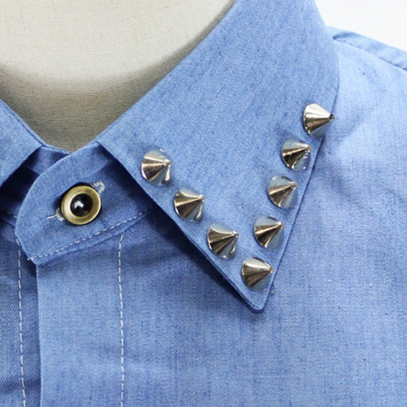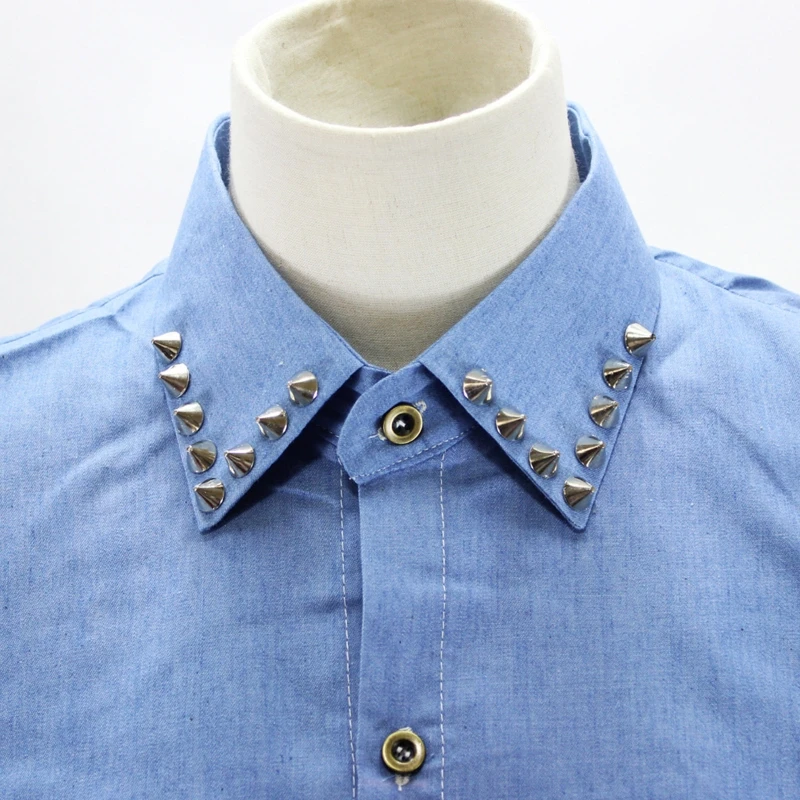 Стиль панк; Отложной воротник с серебристыми шипами и заклепками; Джинсовая синяя рубашка.