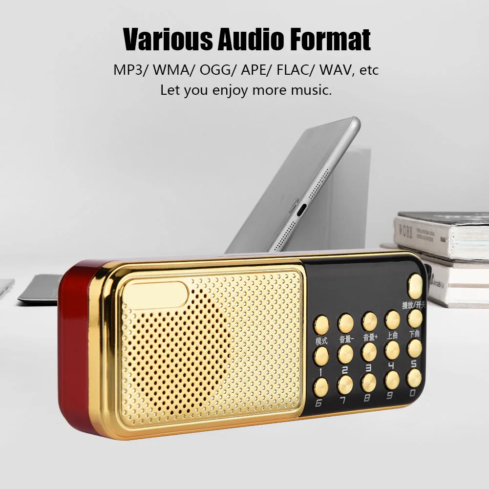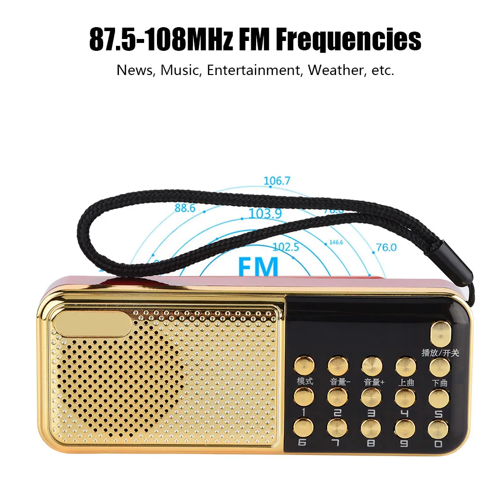 Этот MP3-плеер позволяет свободно слушать радио и музыку с tf-картой. Fm-частоты 87,5-108 МГц помогут вам найти все виды станций, таких как погода, футбол, новости, музыка. Большая емкость tf-карты позволяет слушать музыку, которая вам нравится. И вы можете использовать клавиатуру номера, чтобы выбрать музыку и частоты. Кроме того, hi-fi звук дает вам большое удовольствие от слуха.