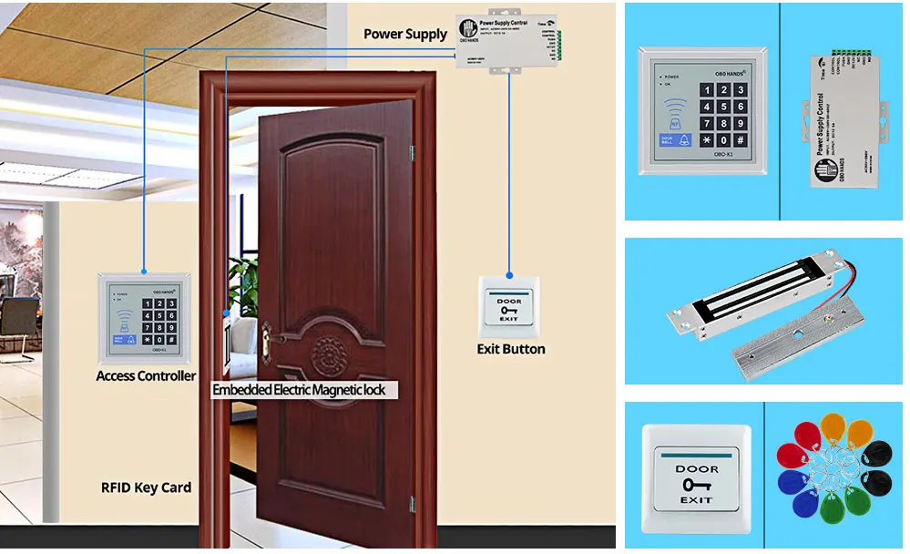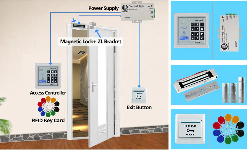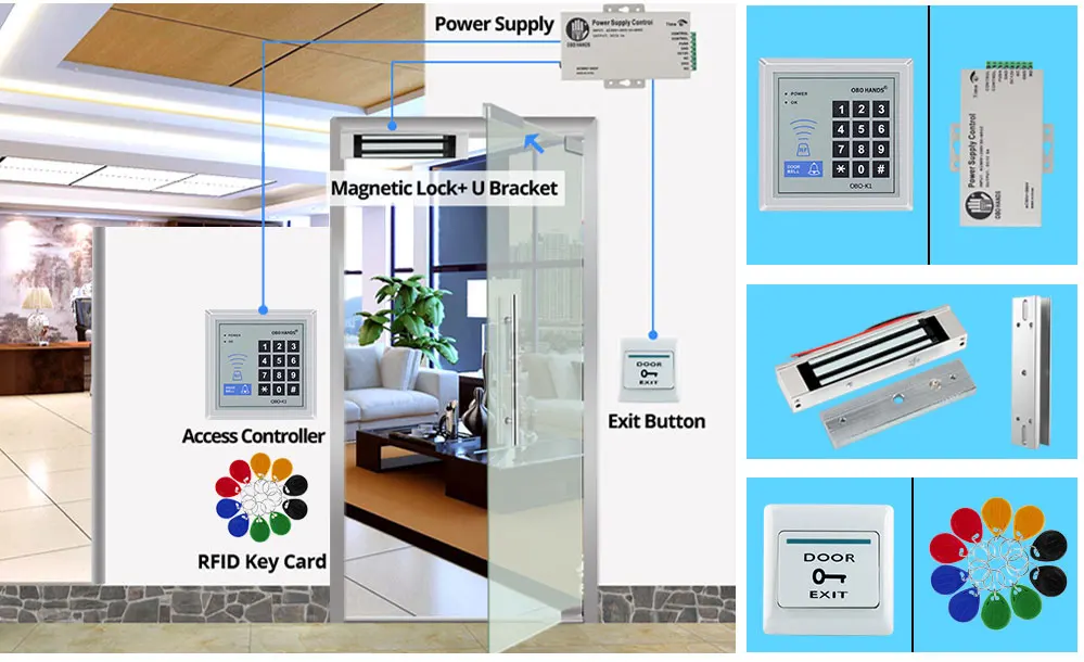 Это полная система контроля доступа, включающая клавиатуру управления доступом, источник питания 12 В постоянного тока, электрический замок, кнопку разблокировки дверей и 10 брелоков RFID. О клавиатуре управления доступом, она является поверхностью водонепроницаемой. Когда на поверхности есть капли воды, это нормально для работы.(Для того, чтобы использовать его долгое время, пожалуйста, не кладите его в воду или используйте в дождь.)О электрическом замке, есть несколько различных моделей на выбор: электрический замок удара, электрический замок падения, 180 кг разворачиваемый магнитный замок, 180 кг встроенный замок и электрический замок болта. Вы можете выбрать другую модель в соответствии с вашей дверью.