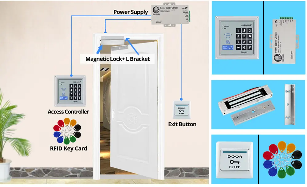 Посмотрите на дверь из помещения, если дверь плоская или дверная рама менее 3 см, вам нужно добавить L-образный кронштейн. Размер кронштейна Д: 170*34*25 мм (Д/Ш/В) Комплектация: 1 * контроллер доступа Стандартный магнитный замок 1*180 кг 1 * L кронштейн 1 * блок питания 1 * Кнопка выхода двери 10 * RFID брелоков 1 * Руководство пользователя