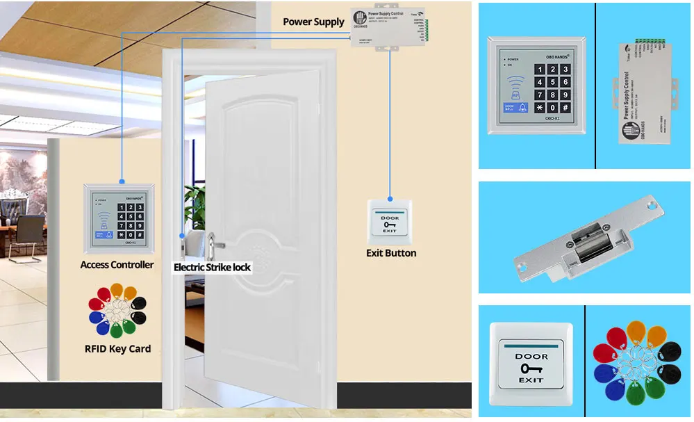 Если у вас уже есть свой электрический замок, вы можете выбрать комплект. Комплектация: 1 * контроллер доступа 1 * блок питания 1 * Кнопка выхода двери 10 * RFID брелоков 1 * Руководство пользователя