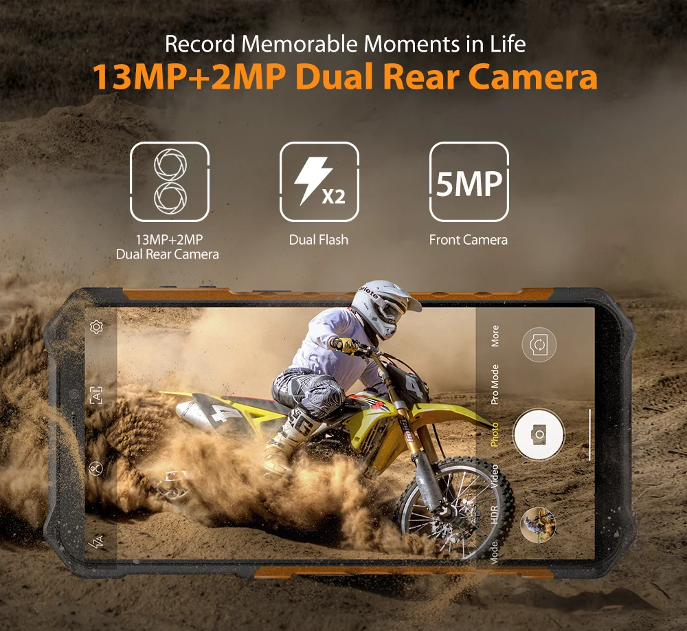 Двойная задняя камера 13MP + 2MP Armor X5 Pro отличного качества фотографии благодаря своей двойной камере (13MP + 2MP). И телефон оснащен двойной задней вспышкой, светильник ить ваши ночные фотографии и камеру 5 Мп с распознаванием лица и селфи.