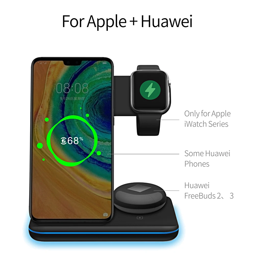 Дополнительно 4 в 1 или 3 в 1 беспроводная зарядная станция может заряжать ваш телефон/Apple Watch series 6/SE/5/4/3/2/1/AirPods одновременно, многофункциональный дизайн обеспечивает аккуратную зарядную подставку. Беспроводное зарядное устройство 3 в 1 требует только 1 зарядный кабель сделает вашу комнату или стол более простым и аккуратным, так что ваша жизнь будет более удобной.