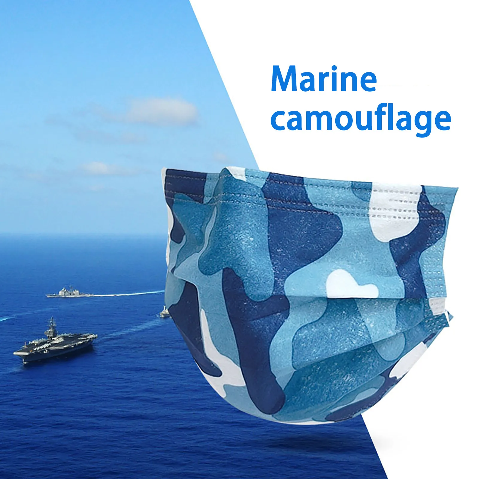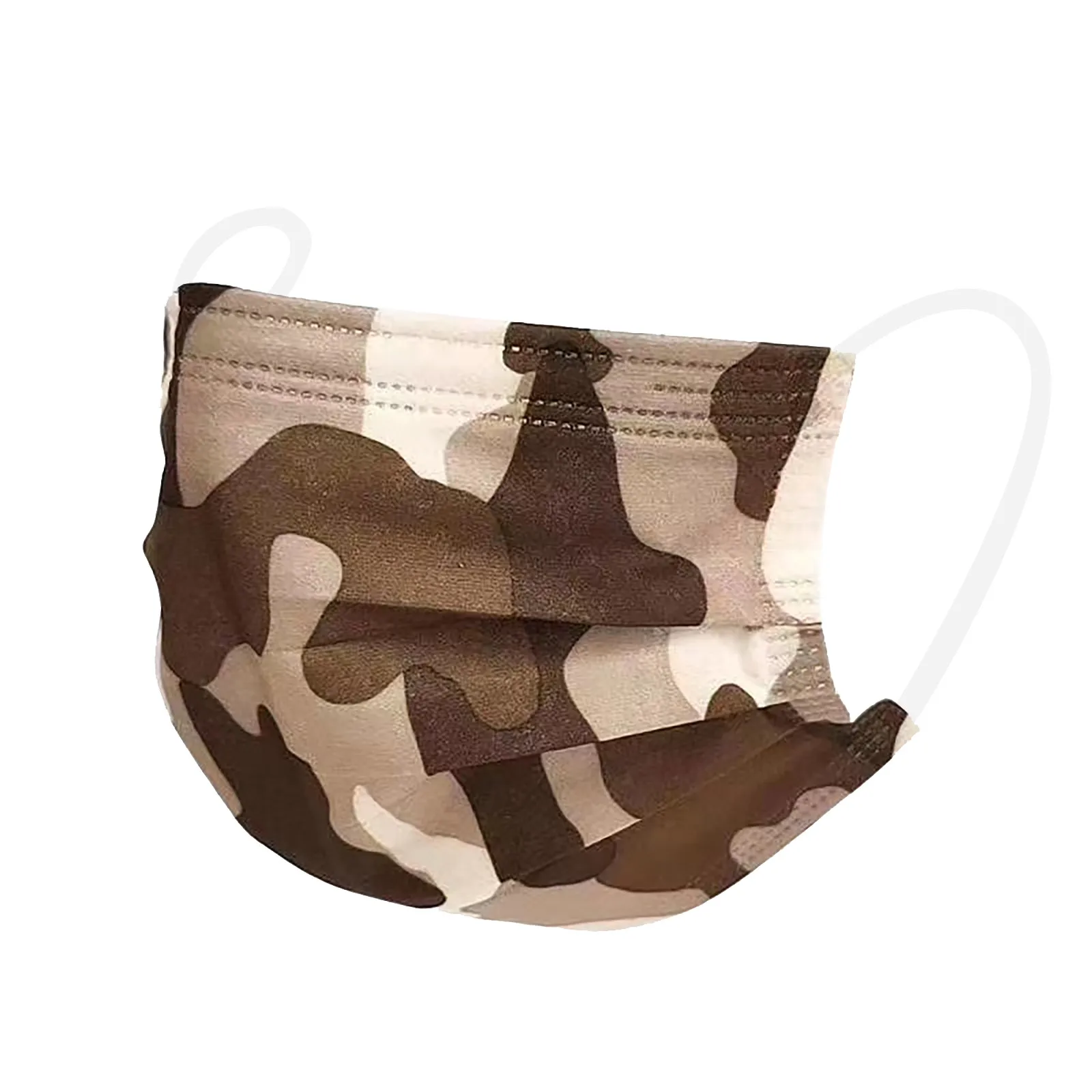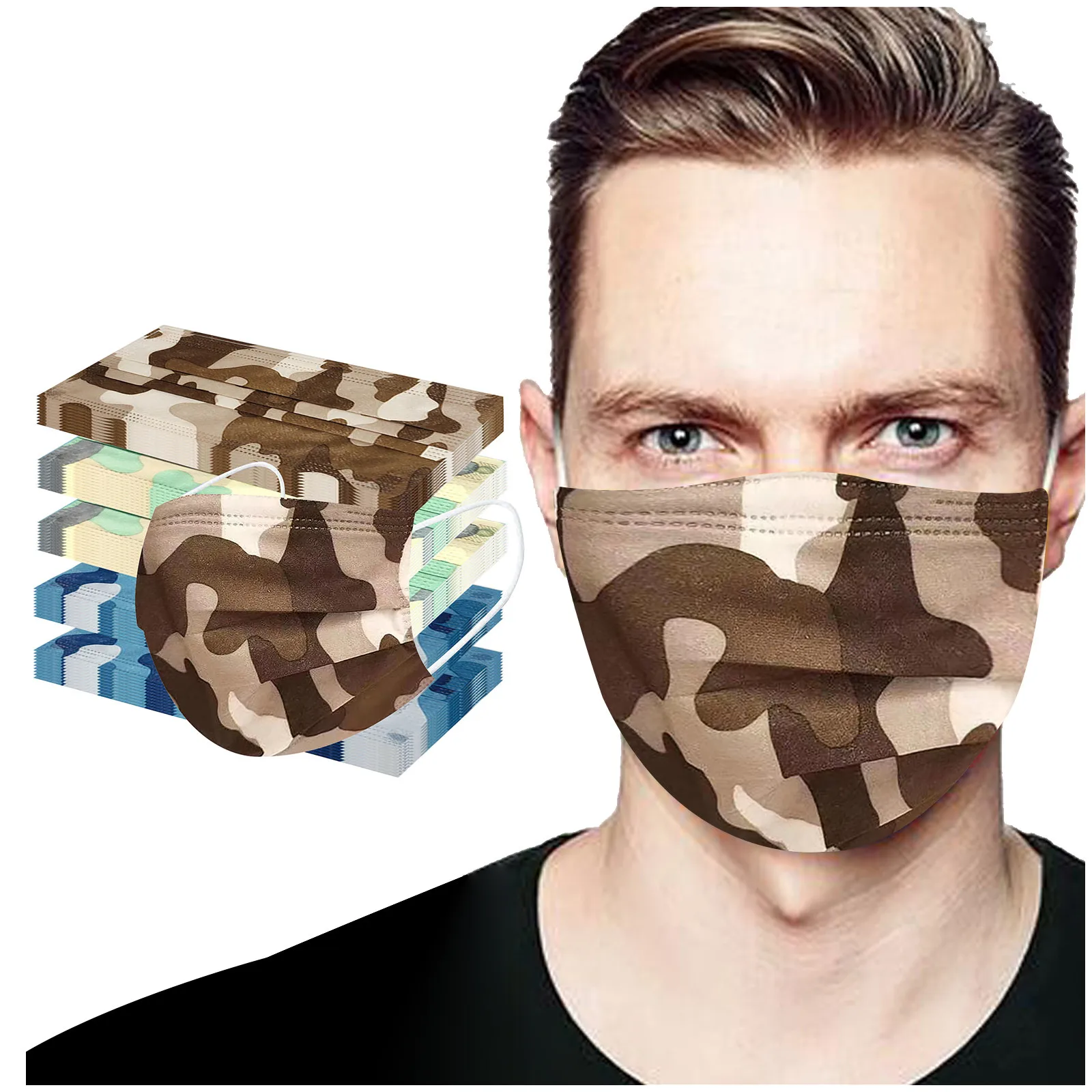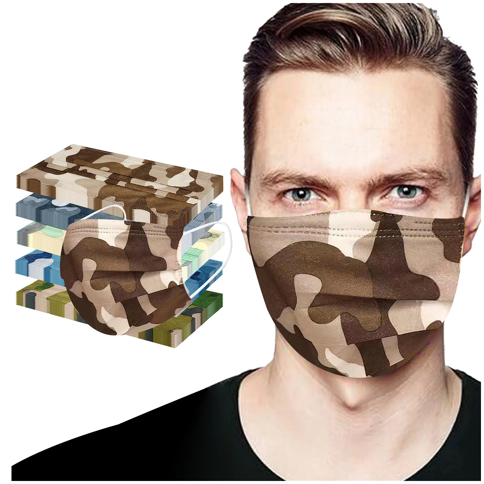 The three-layer non-woven disposable mask is made of three layers of non-woven fusible spray fabric, which is safe and healthy to use. Practical and fashionable. The special three-layer non-woven design provides protection against dust, car exhaust, pollen and so on. Elastic ear hooks, easy to wear, no pressure on your ears. Camouflage print, high quality and high definition, an essential item for your outdoor activities. Adjustable nose strip to adjust the face fit and ensure protection. Features: