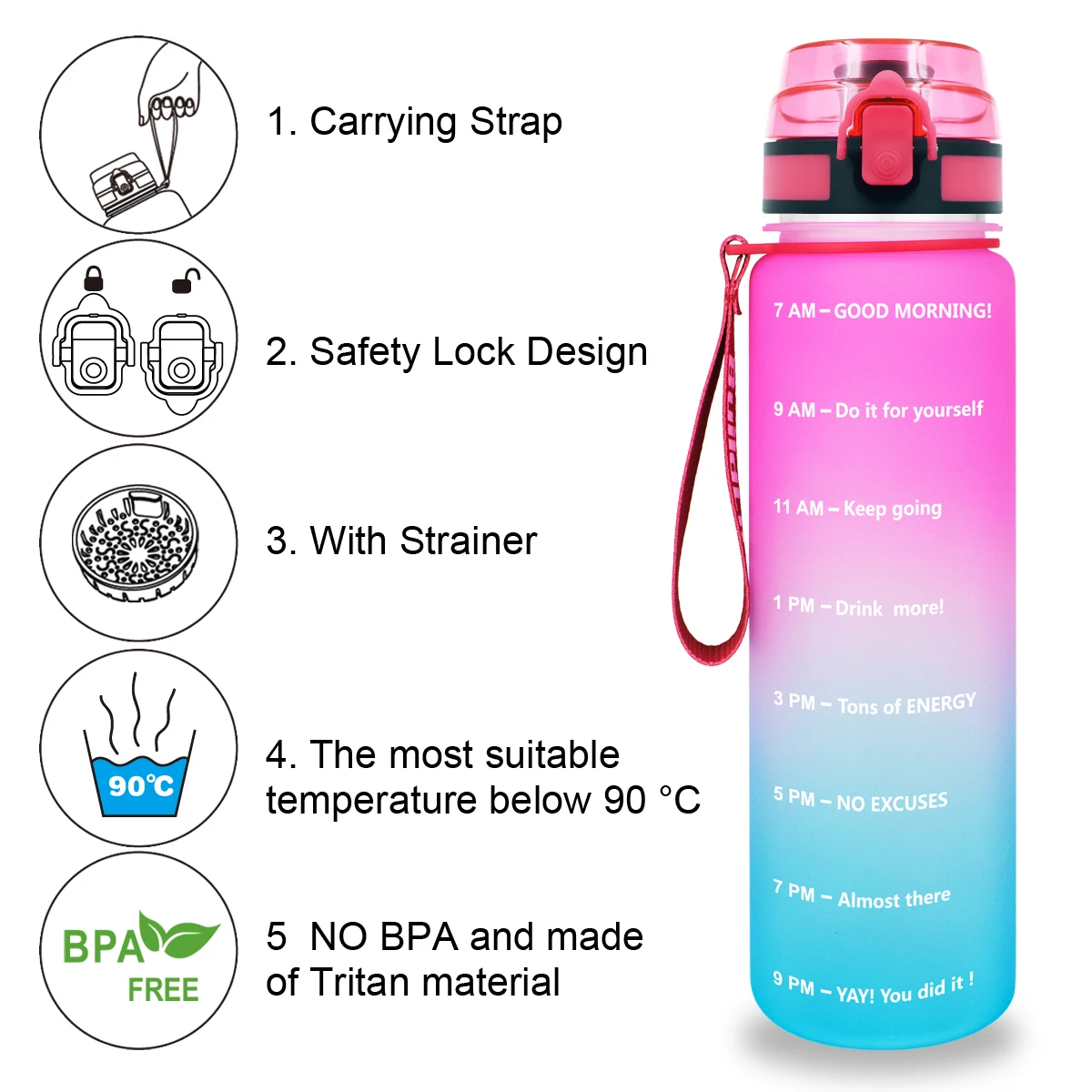 Благодаря эргономичный ремешок и ручке, оснащенной механизмом открывания сверху, эта бутылка для воды облегчает переноску ее куда угодно. Поставляется с разнообразными яркими цветами, это идеальный вариант для ваших любимых, чтобы помочь им сохранить увлажненные и здоровые. Подарок на день рождения! Новогодний подарок! Особенный подарок!