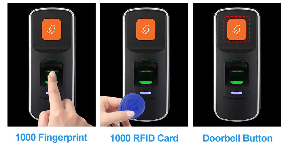 Поддержка 1000 отпечатков пальцев, 1000 карт емкости пользователя, имеет кнопку дверного звонка для более удобного использования.
