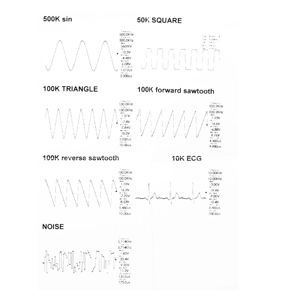 Форма выходного сигнала: Синусоидальная волна, квадратная волна, треугольная волна, передняя волна пилозуба, обратная волна пилозуба, электрокардиограммовая волна, волна шума