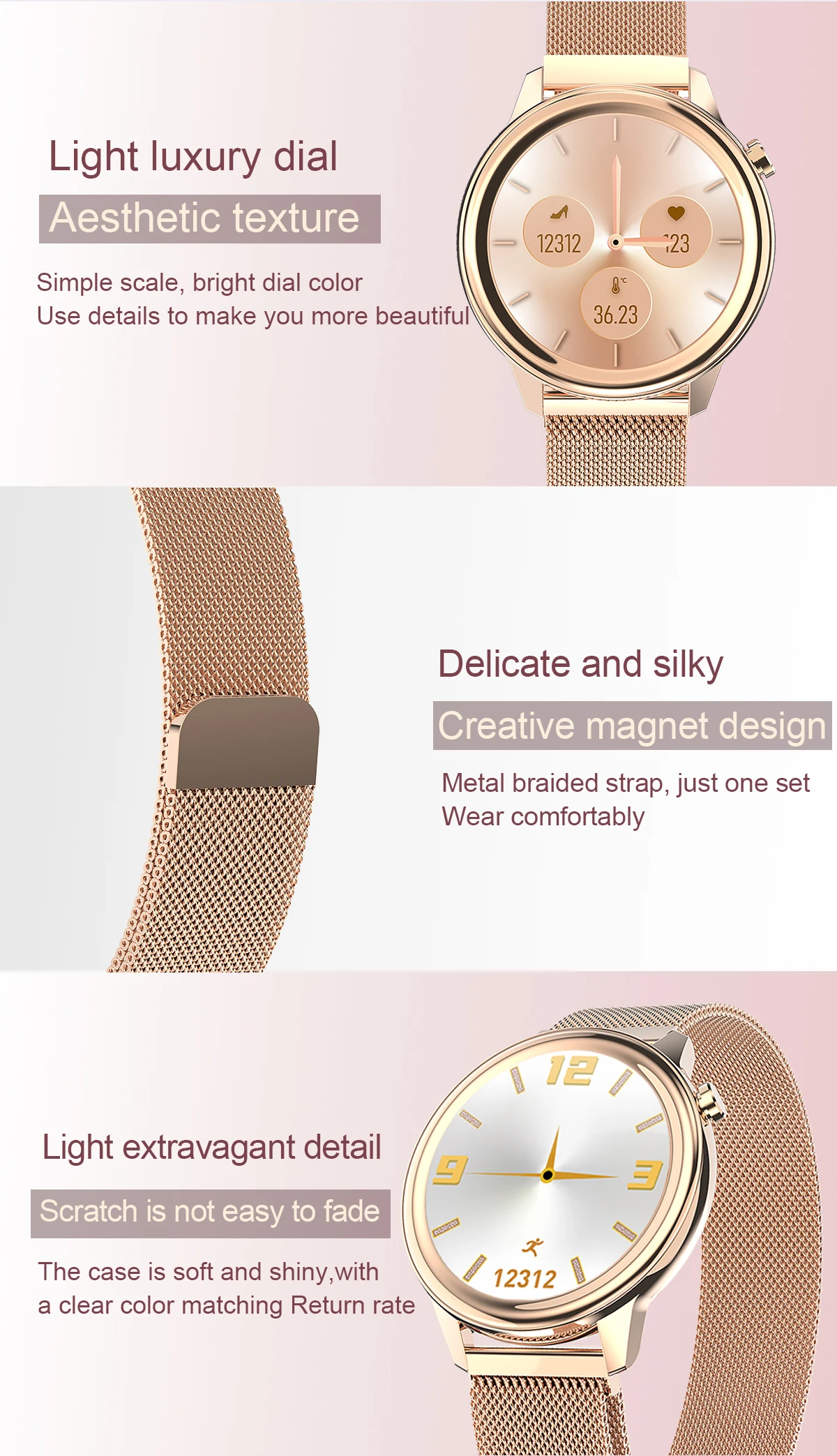 Тип батареи: полиметровая литиевая батарея Батарея Capcaity 200 мАч Магнитное поглощение типа зарядки Время зарядки около 3-4 часов Время выдержки может использоваться 6-13 дней, в режиме ожидания: 20-40 дней Режим манипуляций, полный сенсорный контроль, мобильный телефон APP control Язык "язык приложения, китайский, английский, традиционный, японский, немецкий, испанский, французский, итальянский, тайский, русский Язык прошивки: китайский, английский, традиционный, японский, французский, немецкий, Италия, Испания, Россия, Португалия, Малайзия, Корея, Польша" Материал "Корпус: металлический сплав Нижняя оболочка: PC + ABS Ремешок: металлический Миланский" Цвет 2 цветовых схемы (черный, золотой)