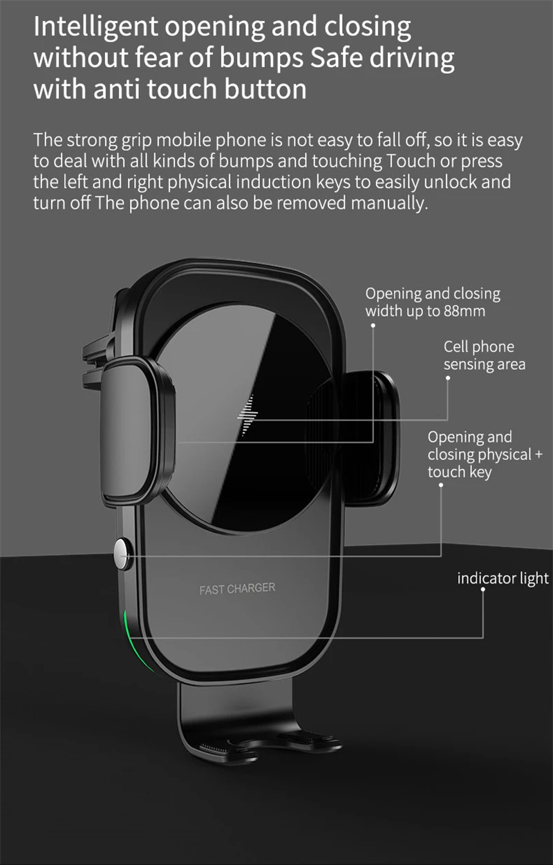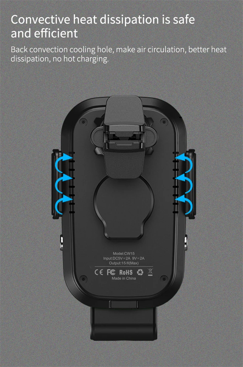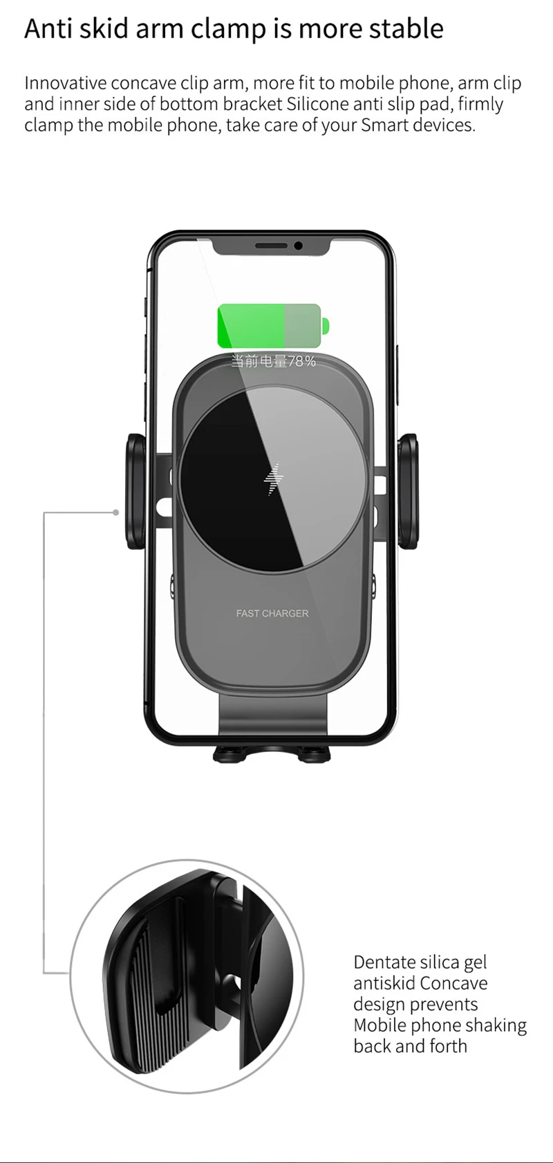 1. Имеет ли ваш телефон функцию беспроводной зарядки? Если нет, он должен быть совместим с беспроводным зарядным приемником для правильной работы. 2. Выходная мощность автомобильного зарядного устройства превышает 15 Вт. При слишком низком уровне функция беспроводной зарядки может не работать. 3. Нет металлических предметов под чехол для телефона, и лучше всего использовать тонкий чехол для телефона. Мы рекомендуем сначала протестировать с голым телефоном. 4. Отрегулируйте высоту основания автомобильного держателя в соответствии с индукционной областью беспроводной зарядки мобильного устройства;