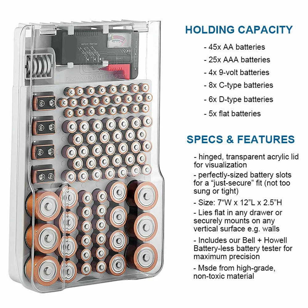 Может держать 93 упаковки батарей, идеально подходит для всех ваших 45x AA, 25x AAA, 4x9 вольт, 8x C, 6x D и 5 плоских батарей
