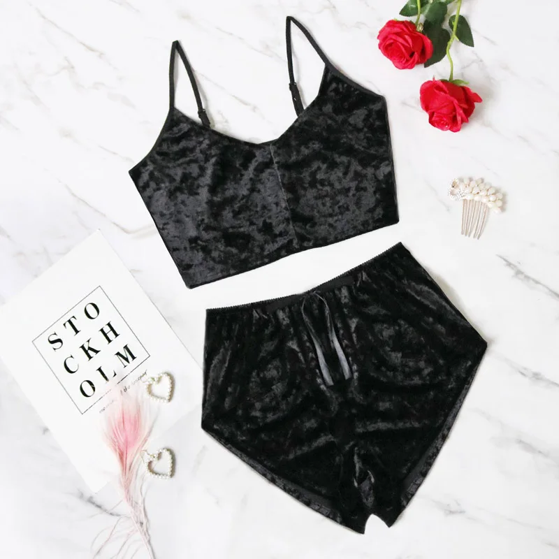 Сексуальный пижамный комплект для вечеринок из 2 предметов, бархатное ночное белье, сексуальные бархатные шорты на бретельках, пижамный комплект, женская одежда для сна.