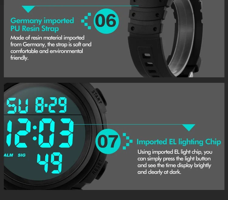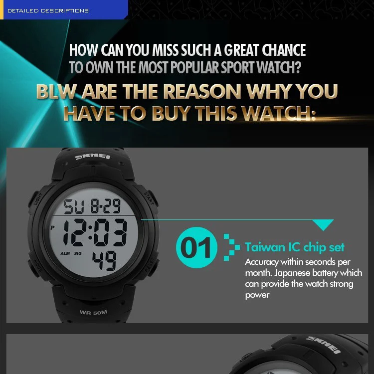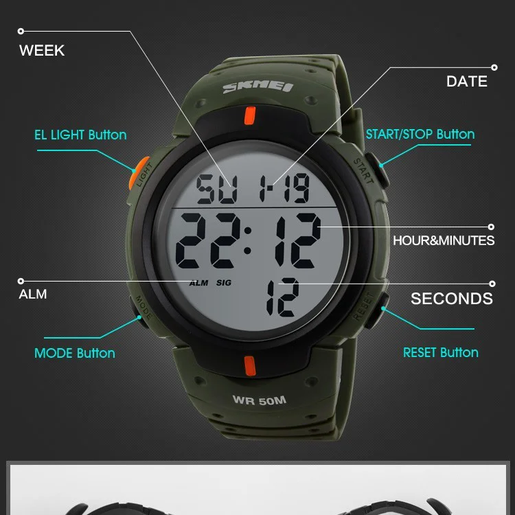 • Функции: Водонепроницаемость, хронограф, будильник, дата, неделя, задний светильник, ударопрочность