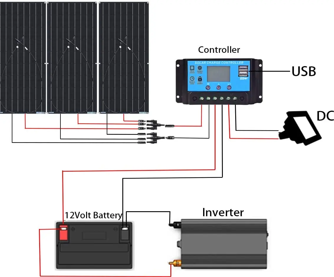 1. 3 шт 120 Вт солнечная панель 2. 30A 12v/24v Контроллер заряда для фотоэлектрических систем 3. 1 комплект удлинительного кабеля с PV разъемом 4. 1 комплект кабеля с зажимом типа крокодил (подключение к батарее) 5. 1 комплект 3 в 1 PV коннектор (параллельно солнечная панель) 6. 1*1000w 12v 220v инвертор