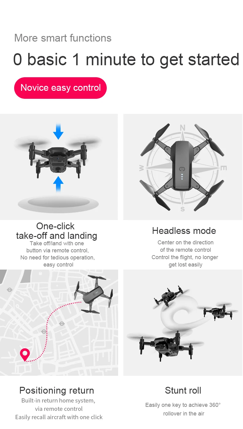 -С функцией режима удержания высоты, полет стабильный. -В безголовом режиме нет необходимости регулировать положение самолета перед полетом. -Легко найти свой путь домой с помощью функции задней панели с одной кнопкой. -Встроенная камера 4K pixelHD. Удивительно, но он может снимать Потрясающие фотографии и видео с неба. -С функцией Wi-Fi, он может быть подключен к приложениям, системе APK, и делать фотографии, видео и передачу в реальном времени через мобильный телефон изображения камеры. -Нарисуйте траекторию полета на экране, Дрон будет летать автономно по указанному пути. -2,4 ГГц технологии анти-помех. -4 канала для подъема, спуска, движения вперед, назад, левого полета, правого полета и катания на 360 градусов». -Шестиосевой гироскоп, плавный полет и более удобное управление. -Светодиодный светильник делает полет более эффектным, особенно в темноте. Функции: вверх/вниз, вперед/назад, влево/вправо, боковой f светильник, светодиодный светильник, Безголовый режим, автоматическая кнопка возврата, режим удержания высоты, WiFi FPV Посылка включает в себя: 1 Дрон 1 пульт дистанционного управления 1x3,7 V 500 мА/ч, Батарея 1 х USB кабель для зарядки 4 x запасного лезвия 4 x защитный чехол 1 х Руководство 1 * отвертка