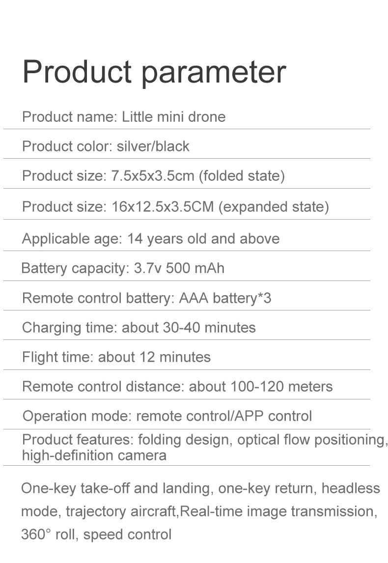 Номер товара. : FEMA-E3 Версия: без камеры, с камерой 1080P 1, с камерой 4K 1, с камерой 4K 2/(опционально) Гироскоп: 6-axis Частота: 2,4G Канал: 4CH Двигатель: 716 щеточный Бескаркасный двигатель Батарея: 3,7 V 500MAH литий-полимерный Батарея (все указанные аккумуляторы входят в комплект поставки) Мощность передатчика: 3 аккумулятора AAA (не входят в комплект) Время полета: около 8 ~ 12 минут Время зарядки: 80 минут Дистанция RC: 80 м Расстояние FPV: 50 м FPV: WiFi Разрешение: без камеры, 4K Фото разрешение, 1080P видео разрешение, 480P Нижняя камера разрешение