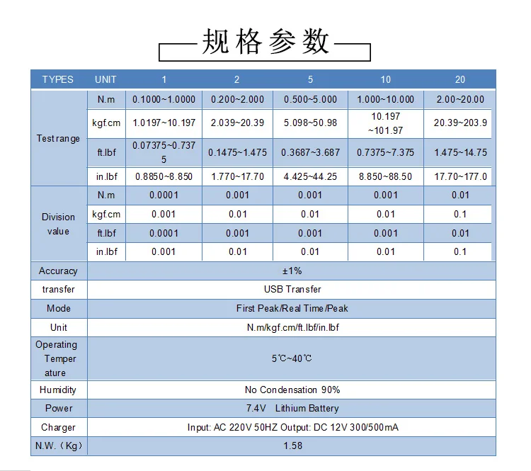 Точность: ± 1% Передача: USB Передача Режим: Первый пик/реальное время/пик Единица измерения: N.m/kgf.cm/ft.lbf/in.lbf Рабочая температура: 5 ℃ ~ 40 ℃ Влажность: без конденсации 90% Мощность: 7,4 В литиевая батарея Зарядное устройство: Вход: 220 В переменного тока 50 Гц Выход: 12 В постоянного тока 300/500 мА Вес нетто (кг): 1,58