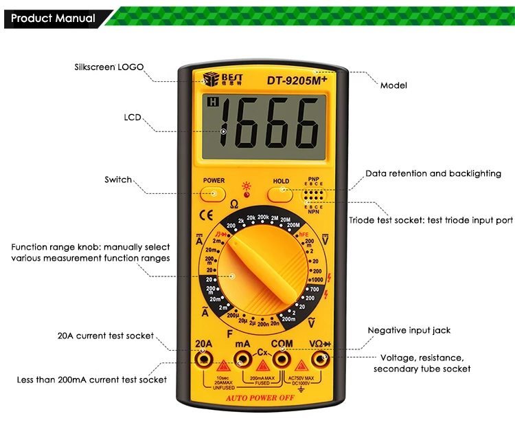 Мультиметр DT-9205M + улучшенная версия, оптовая продажа, лучший портативный ЖК-экран 9205 м, цифровой мультиметр с зуммером, измеритель