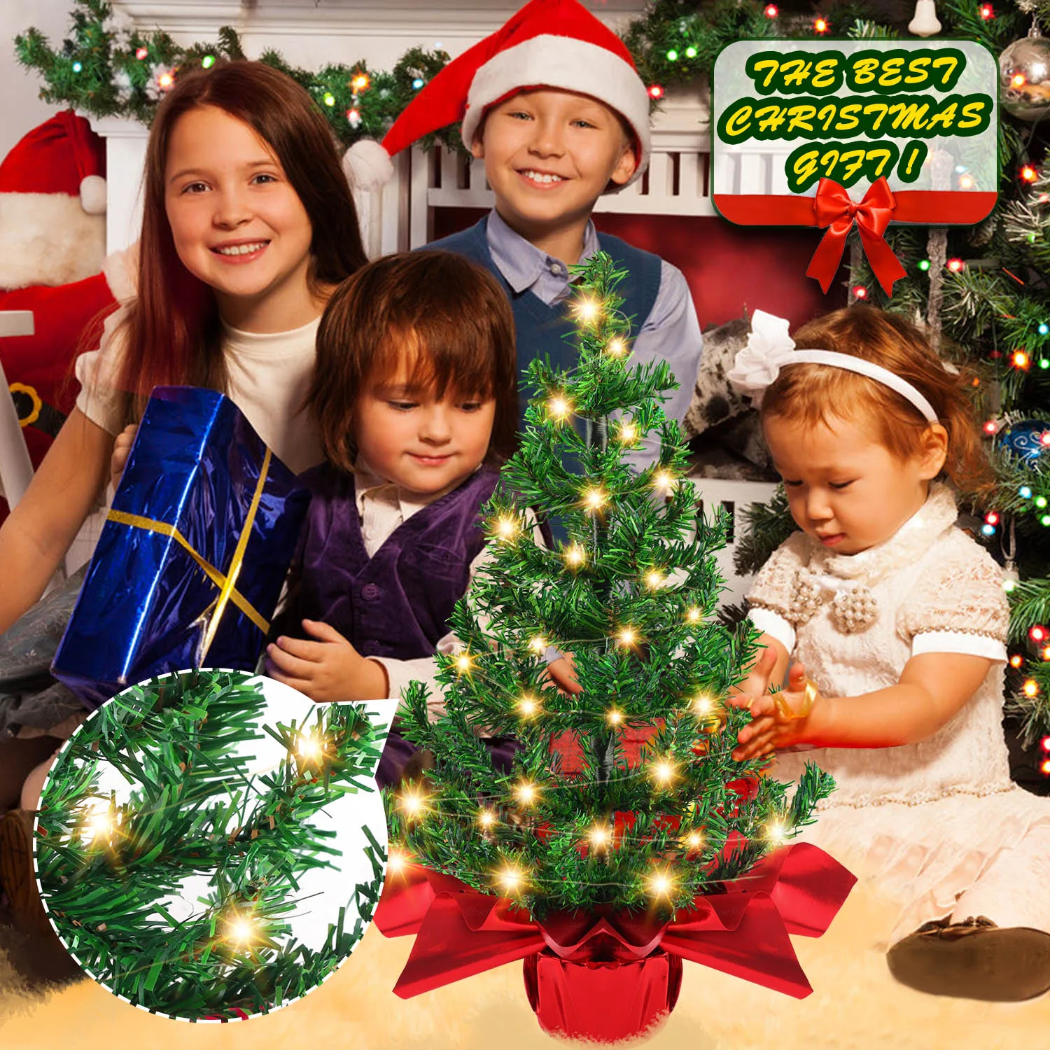 Простая настройка:Просто вставьте елку в цветочный горшок, Украсьте ее Красной тканью и закрепите лентой, затем оберните ленту со светодиодный Ной подсветкой на елку.