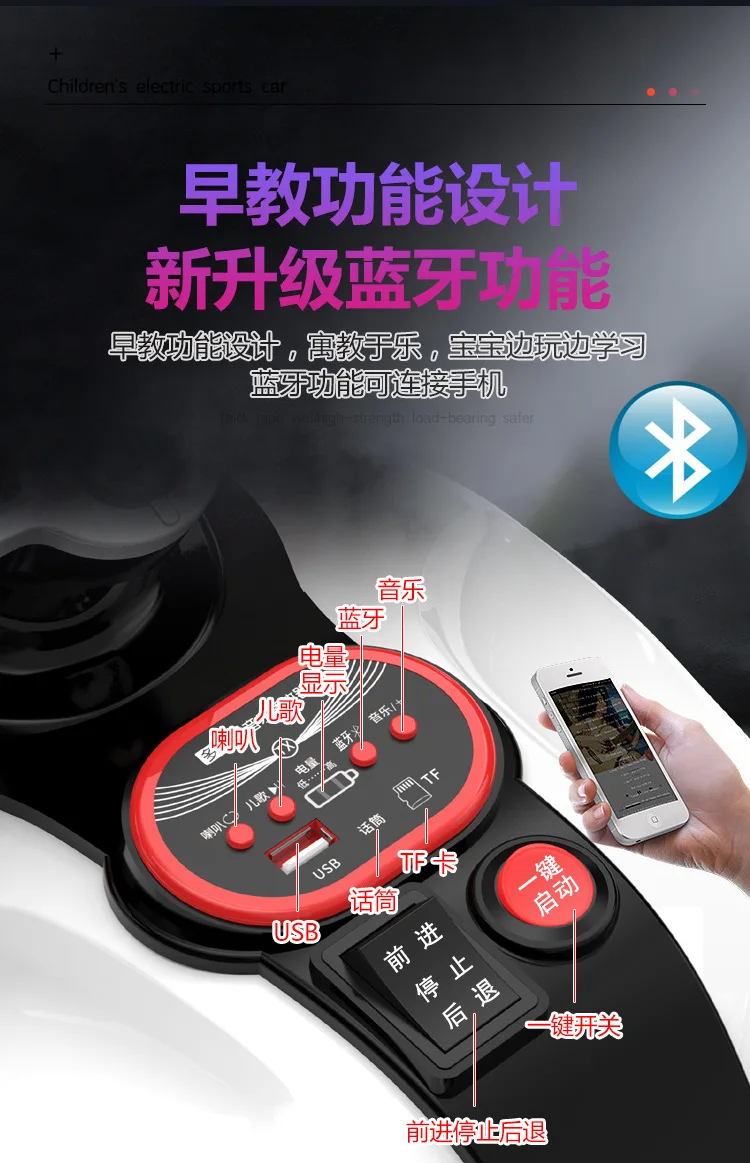 Введение функции: запуск одной кнопкой, многофункциональная ранняя образовательная музыка, история, английский язык, дисплей батареи, подключение по Bluetooth, usb-порт, карта памяти, светодиодный яркий светильник, Двойной привод, две батареи 6V4, нагрузка 200 кг, срок службы батареи 5 км, поставляется с несколькими музыкой, поддерживает загрузку, есть три/два тура на выбор