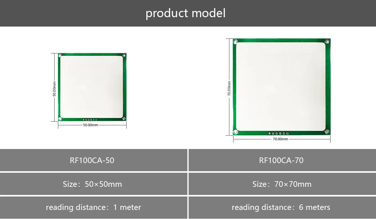В соответствии с размером коэффициента усиления, эта серия продуктов включает в себя два продукта: модуль RF100CA-50 с керамической антенной 50*50 мм и модуль RF100CA-70 с керамической антенной 70*70 мм.