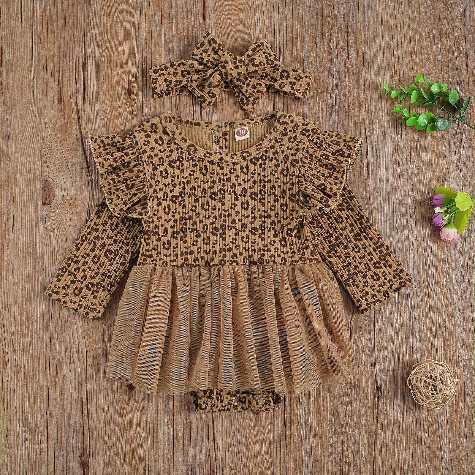 Платье для новорожденных девочек с леопардовым принтом и длинными кружевными рукавами; Короткая трикотажная юбка и повязка на голову; Комплект из 2 предметов
