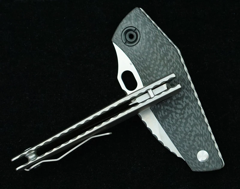Общая длина: 180 мм Длина лезвия: 70 мм Длина ручки: 110 мм Толщина лезвия: 3,5 мм Ширина лезвия: 35 мм Поверхность лезвия: каменная стирка Система: медное уплотнение Твердость: 59-60 HRC Вес нетто: CF 98g G10 102g ti 120g Материал лезвия: D2 (100% D2) Материал ручки: углеродное волокно + titanium, G10 + титановая резка с ЧПУ, процесс литья. Поверхность ручки: каменная стирка