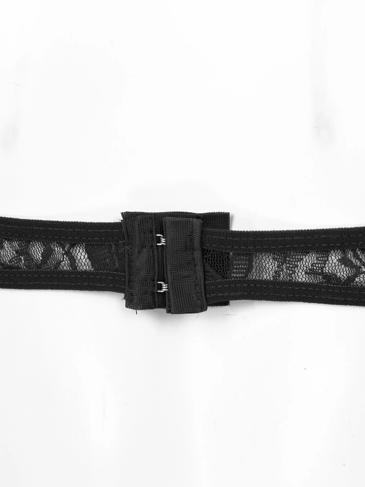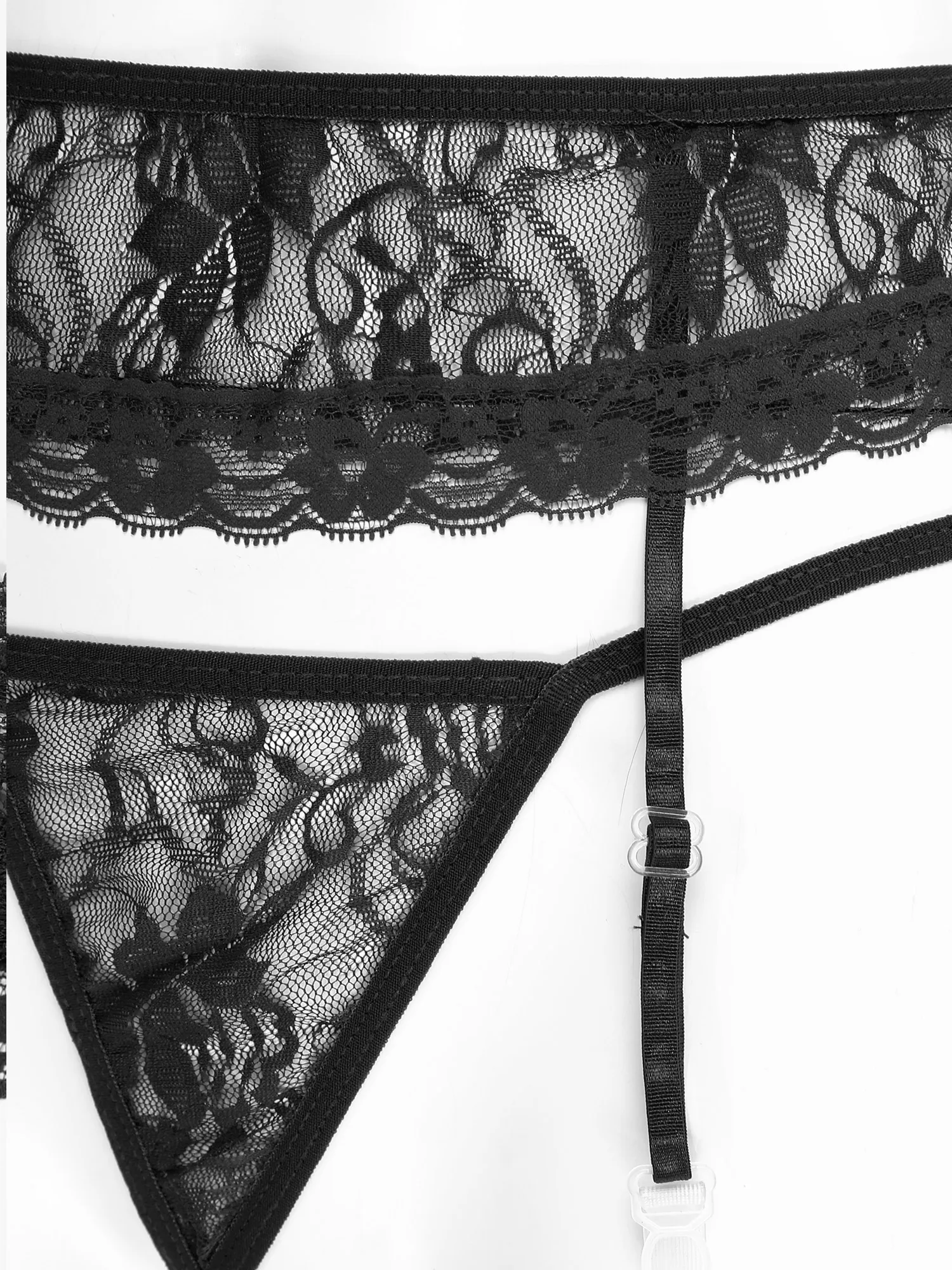 В комплект нижнего белья входят прозрачный кружевной бюстгальтер на косточках, стринги и пояса для подвязок.