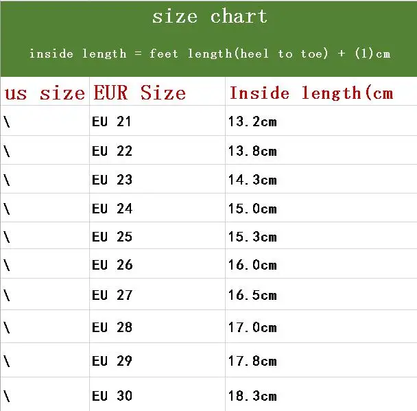 ---(1) Usually, inside length = feet length(heel to toe) + (1)cm. ---(2) If your foot is fat and wide, Please select a bigger size. ---(3) China Size is usually smaller than EUR/RU size. ---(4) If you don't know how to select ,tell us child foot length