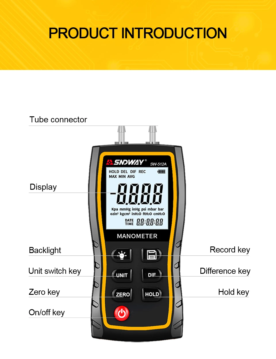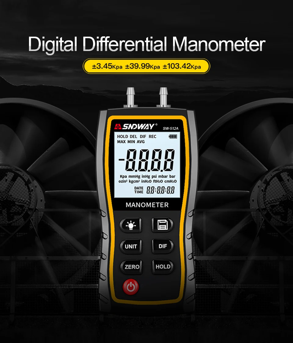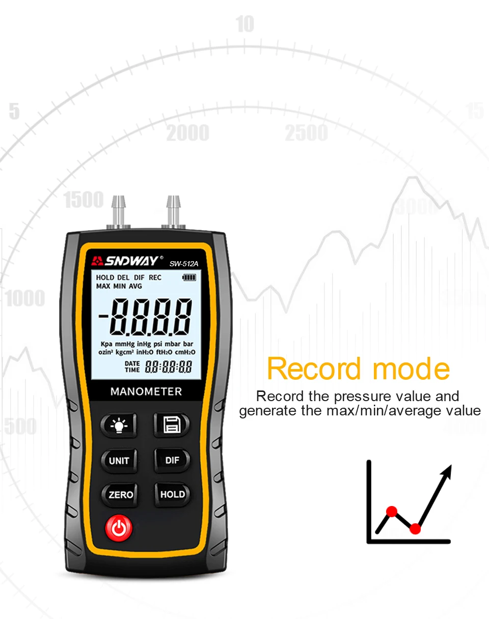 Манометр может измерять дифференциальное давление/положительное давление/отрицательное давление со следующим дополнительным блоком: кПа, мм рт. Ст., инхг, psi, mbar, bar, ozin, kgcm, inH O, ftH O, cmH2O. Это незаменимый измерительный прибор для отопления и вентиляции кондиционирования воздуха для техников, инженеров по эксплуатации, И научными исследователями для простой работы и четкого чтения.