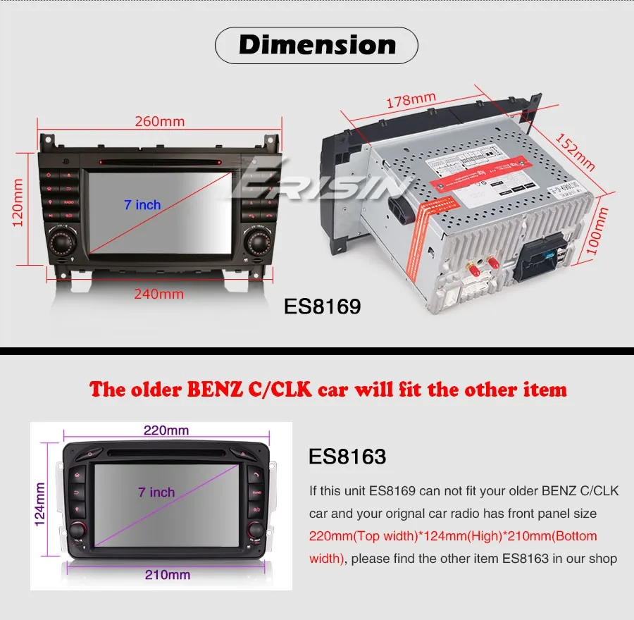 3. If this unit's Front Panel Size can not fit your BENZ C/CLK older model car, please find the other item ES8163 in our shop.