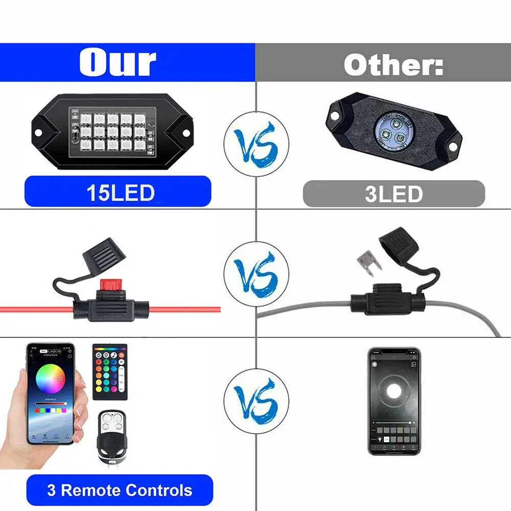 Применение: Инженерные транспортные средства: экскаватор, дорожный каток, бульдозер, кран, вилочный погрузчик и Горнодобывающий грузовик и т. Д. Специализированные транспортные средства: пожарная машина, Полицейская машина, спасательная машина, транспортное средство связи, военное командное транспортное средство и т. д. Внедорожные транспортные средства: UTV, песочные рельсы, багги, квадроциклы, внедорожники, грузовики, поезд, автобус, танк и т. Д. Другие: лодка, рыбалка, лампа для внутреннего двора, яхта, дорожная уличная лампа и т. д. Характеристика: 3 3 режима управления: 4 ключа и 24 ключа дистанционного управления, управление приложением, чтобы избежать проблемы подключения, который вы можете регулировать скорость изменения, яркость и стробоскопическую скорость. Вы можете управлять более чем 2 комплектами рок-ламп вместе. IP68 Водонепроницаемость IP68: Водонепроницаемость IP68, защита от пыли и ржавчины, прохождение любого сильного дождя или суровой снежной погоды. Мы тестируем неоновое освещение под водой в течение 3 часов подряд, и все они хорошо работают. Пожалуйста, обратите внимание на водонепроницаемость контроллера, не подверженный воздействию внешней стороны. RGB разноцветный и музыкальный режим: Установите приложение, вы можете выбрать 16 миллионов цветов, каждый стручок может снимать супер широкоугольные огни до 150 ° набор рок-ламп следует ритму вашей музыки, включая медленную, расслабляющую мелодию и танцевальную музыку. 10 10 стручков с чипом высокого качества: MustWin rock светильник s наборы имеют 15 SMD бусин, больше, чем другие наборы рок-светильник. Высококачественная светодиодная микросхема обеспечивает более яркое освещение и низкое энергопотребление. Widely широкое применение и гарантия: наборы рок-ламп могут широко использоваться в автомобилях, внедорожниках, грузовиках, квадроциклах, UTV, внедорожниках, мотоциклах и лодках ATV, также используются для внутреннего, купольного, неонового освещения, лампы для яхты и т. Д. 2 типа крепления в комплекте, сверло или нет. Мы предоставляем 2 года гарантии и пожизненную поддержку. Мы всегда будем здесь для вас. Характеристики: Название продукта: 10 шт. в упаковке 5050 RGB автомобильные рок-огни Мощность: 18 Вт/заданная Величина (около 1,8 вт/шт) Рабочее напряжение: 12 В постоянного тока Степень водонепроницаемости: IP68 Светодиодный чип: 15 ламп/шт 5050 светодиодный Дополнительный цвет: черный Материал корпуса: ПВХ Три метода управления: Bluetooth App + RF (4-кнопочный/входит ПДУ с 24 кнопками) двойной дистанционный пульт Срок службы: 50000 часов Размер: около 8,9x8,2x2,8 дюймов Гарантия: 2 года Pacakge список: Сертификация FCC, цветная упаковка 10 шт. * RGB светодиодный светильник 1 шт * входит ПДУ с 24 кнопками дистанционный пульт 1 шт. * 4 ключа дистанционного управления 1 шт. * контроллер 8 шт. * 1,2 м удлинитель 1 шт. * 1 м провод с переключателем 1 шт. * Руководство + инструкция по эксплуатации 2 шт. * запасной предохранитель 1 шт * 1 drag 10 соединительная линия 1 комплект * Монтажный комплект