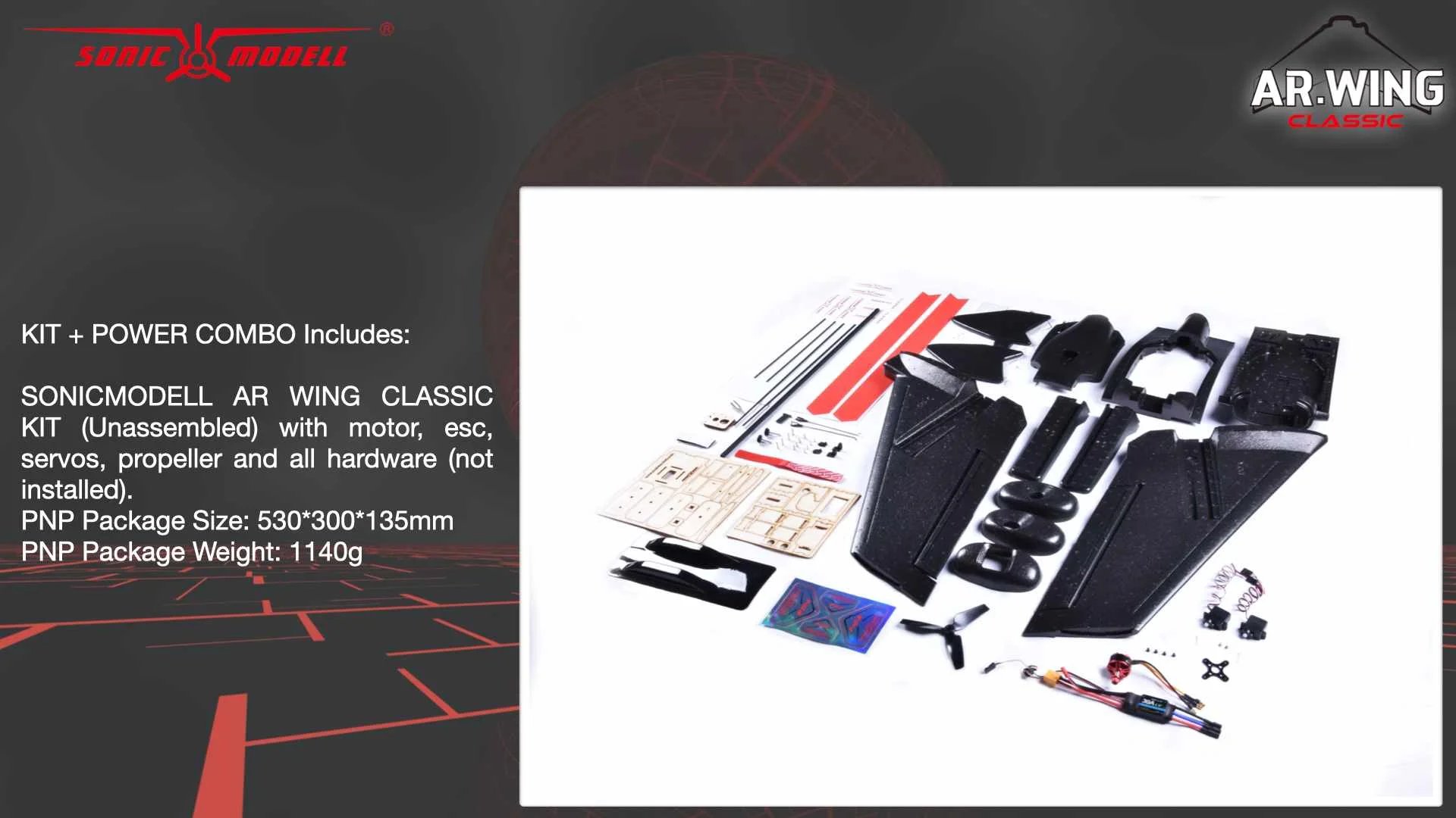 Комплект SONICMODELL AR WING CLASSIC (в разобранном виде) с двигателем, esc, сервоприводами, пропеллером и всем оборудованием (не установлен).