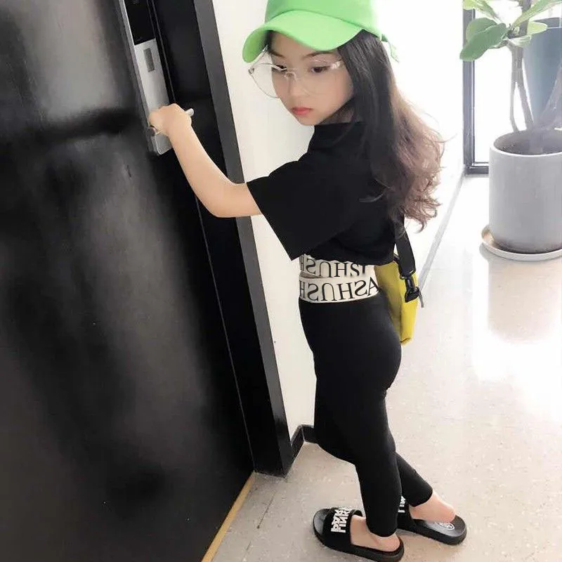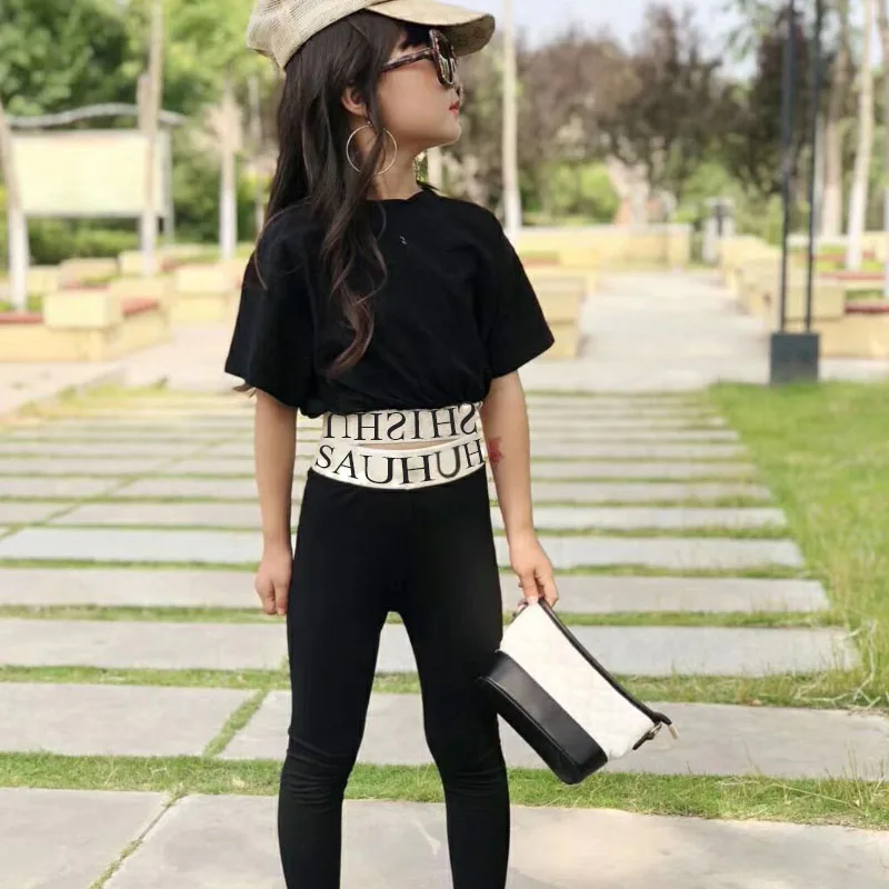 От 2 до 8 лет Одежда для девочек, Модный комплект из двух предметов, футболка с короткими рукавами и талией на талии + облегающие брюки стрейч, качественная детская одежда