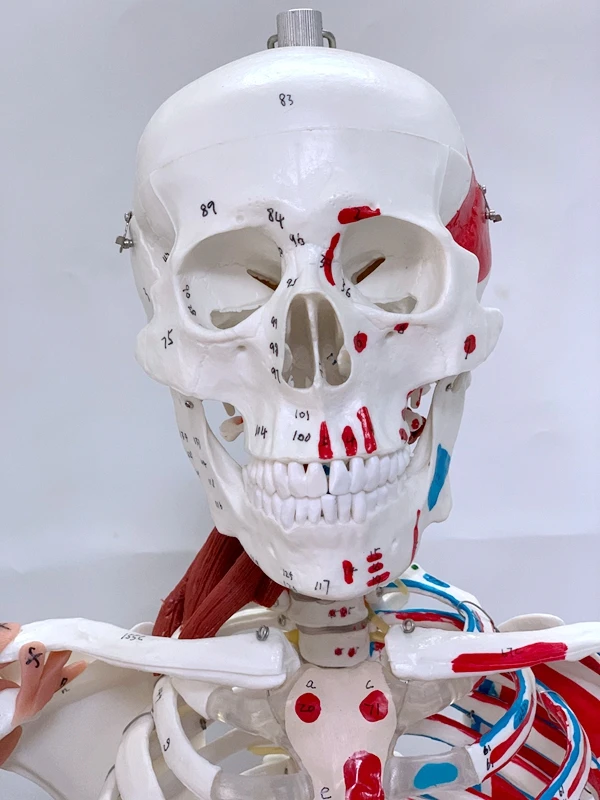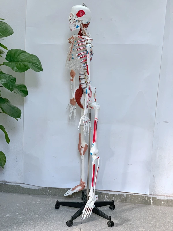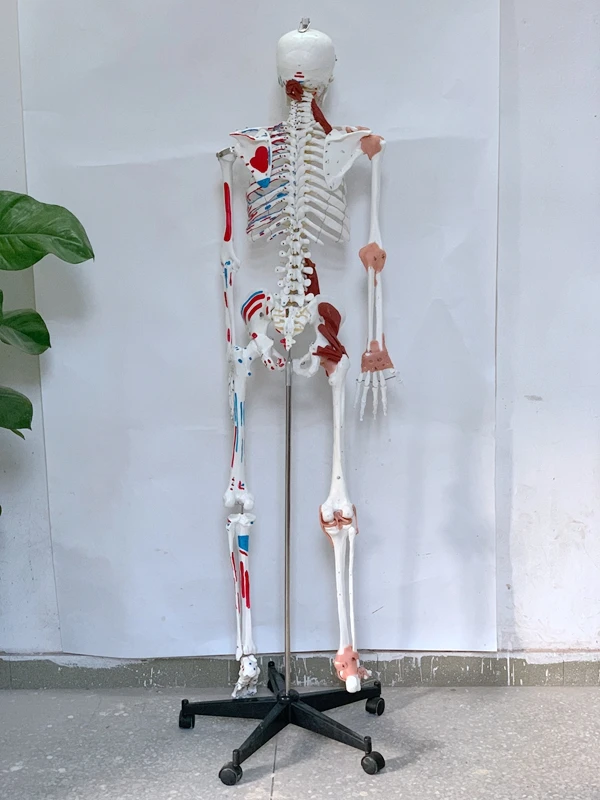 This economical, life-size, articulated model is an ideal model for basic anatomy teaching. It is high-quality and inexpensive. The arms and legs can be removed for research. Shows nerve branches, vertebral arteries and lumbar intervertebral discs. The skull contains a movable chin, a movable skull cap, bone sutures and three removable lower teeth. It is placed on a solid 16-inch metal frame and equipped with pentagonal universal wheels for easy movement. Made of PVC, washable, not broken, with dust cover. Size: 170CM.