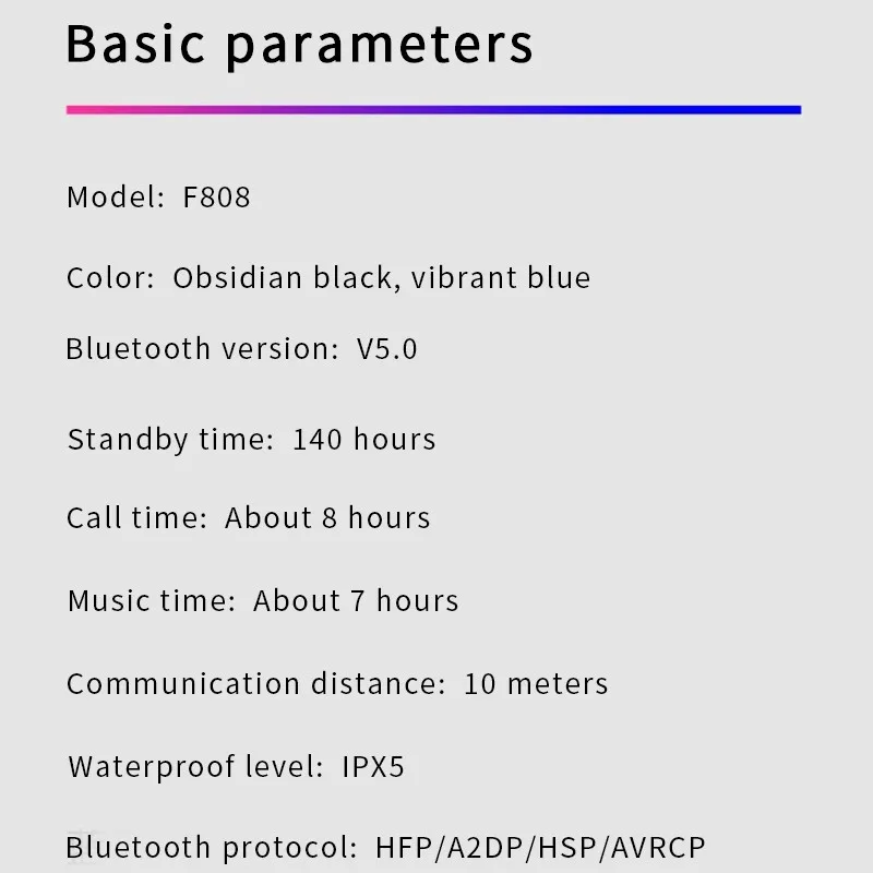 Версия Bluetooth: V5.0 Время работы в режиме ожидания: 140 часов Время разговора: около 8 часов Время воспроизведения музыки: около 7 часов Расстояние связи: 10 метров Класс водонепроницаемости: IPX 5 Протокол Bluetooth: HFP/A2DP/HSP/AVR CP