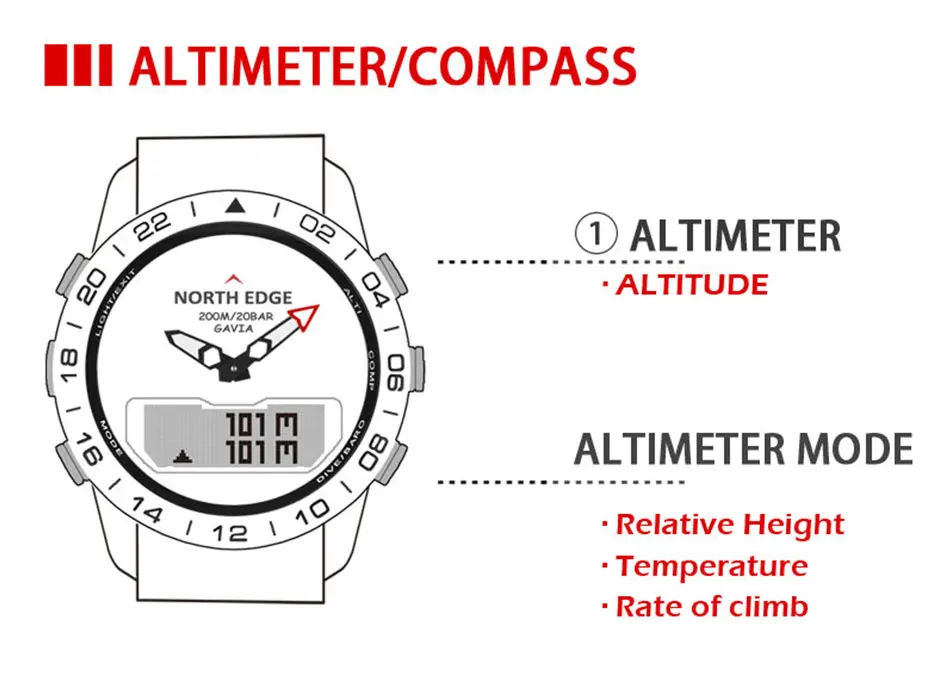 Альтиметр/барометр/Компас/дайвинг/водонепроницаемый 200 м/Двойное время/отсчет/калории/Будильник времени/температура/подсветка/напоминание о низкой мощности/шагомер/Устойчивость к низкой температуре