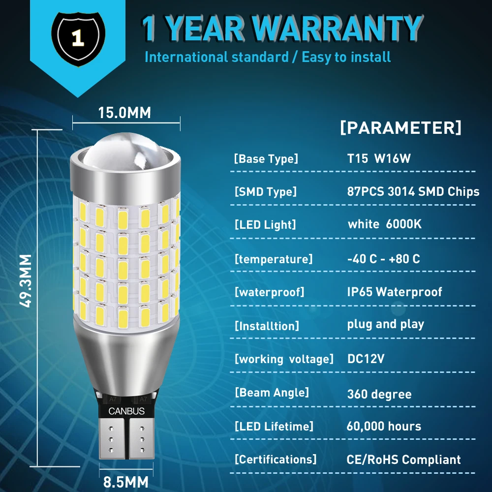 Розетка: T15 W16W 912 921 1. Напряжение: DC12V 2. Входная мощность: 8 Вт 3. Люмен: 2400lm 4. Цвет: 6000K ксеноновый белый 5. Идеальная замена для старой галогенной лампы