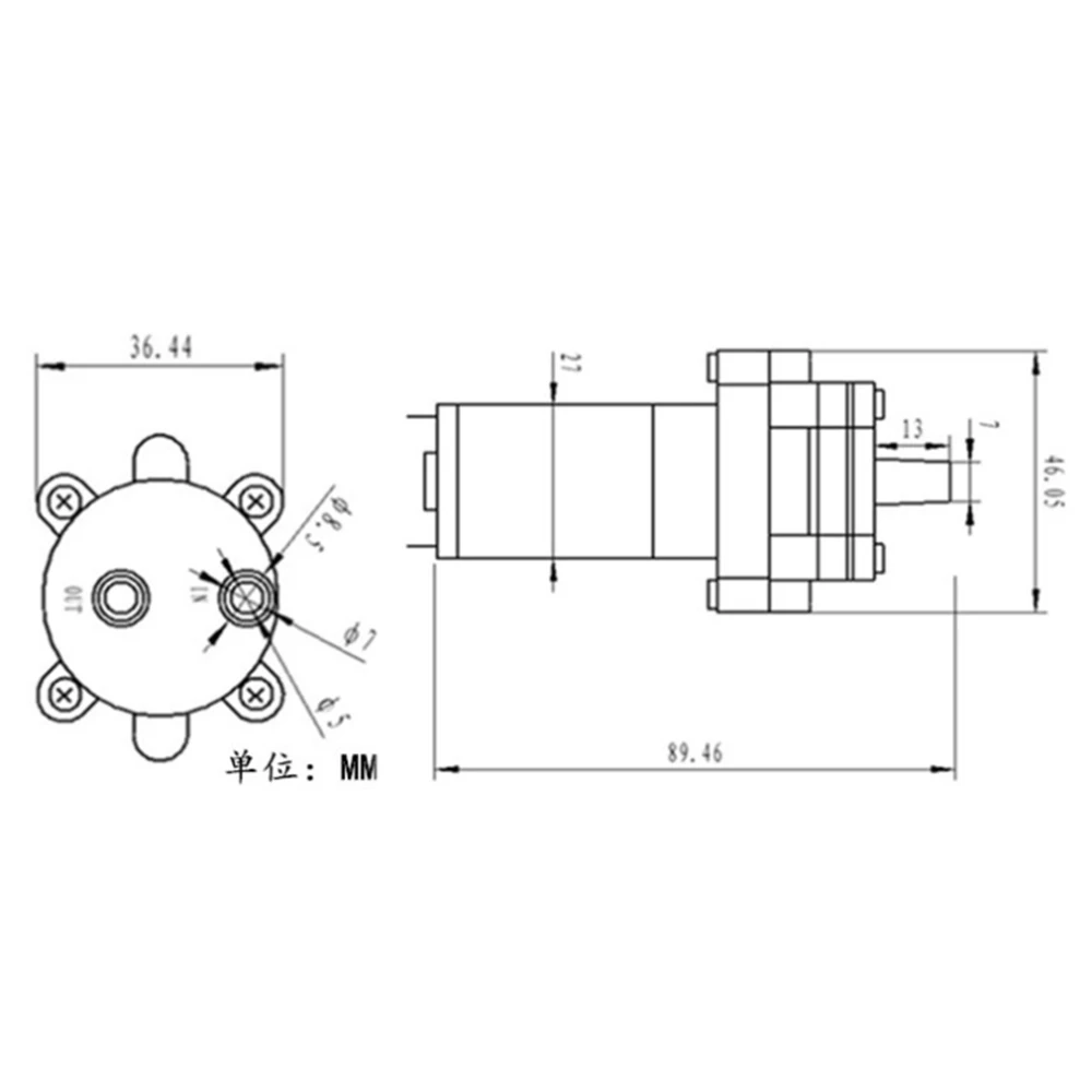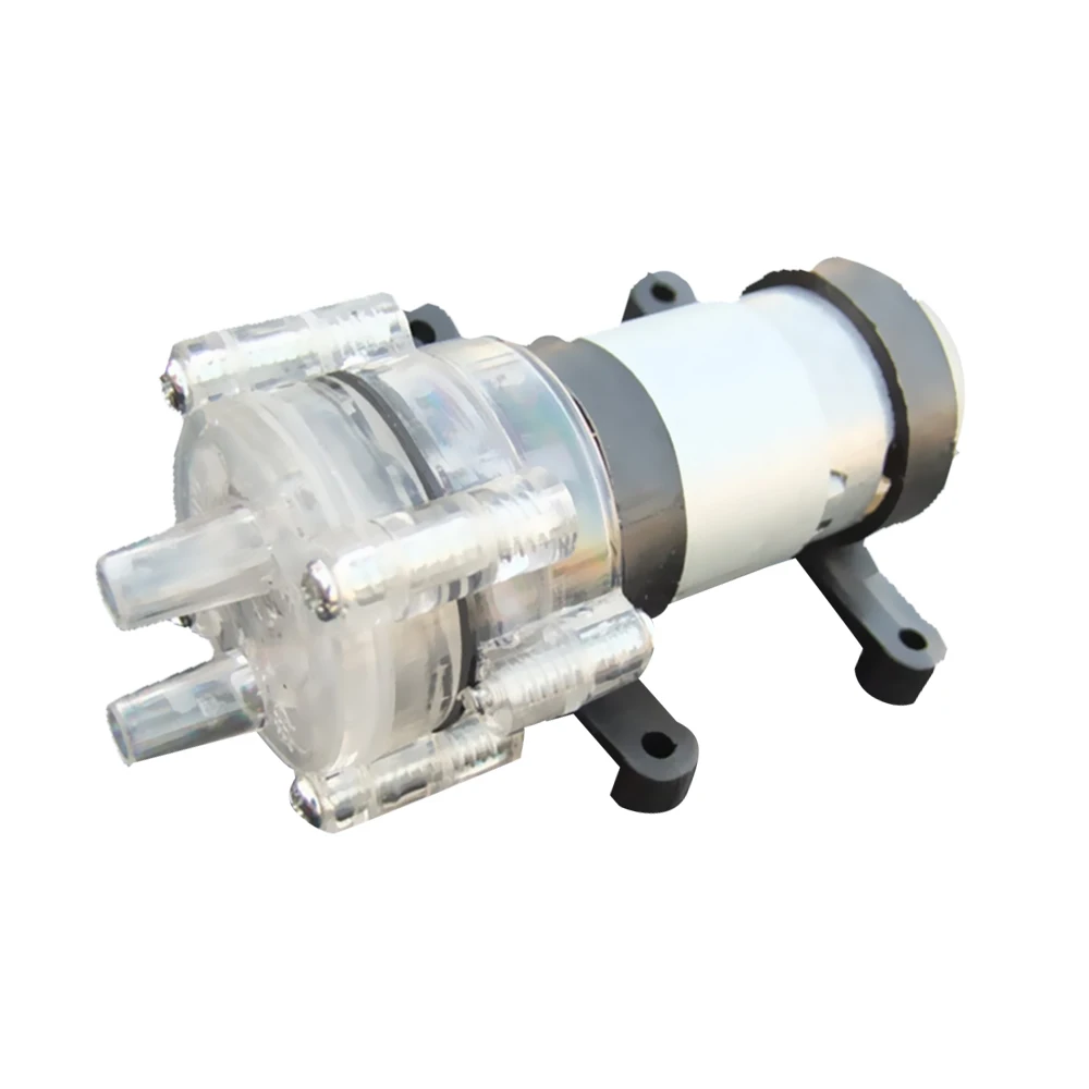 Микро dc имеет щеточный диафрагменный насос, газ и жидкость, он основан на объёмном насосе оригинального дизайна. Питается от вращения двигателя, посредством вала двигателя эксцентрикового колеса, приводной резиновой петли, возвратно-поступательного движения, всасывания и разряда внутри действия формирования полости, через обратный клапан закрыт, открыт, чтобы добиться всасывания и слива газа и жидкости. Он может набрать холодную или горячую воду, Который может достигать расхода воды 1,3-1,7л/мин.