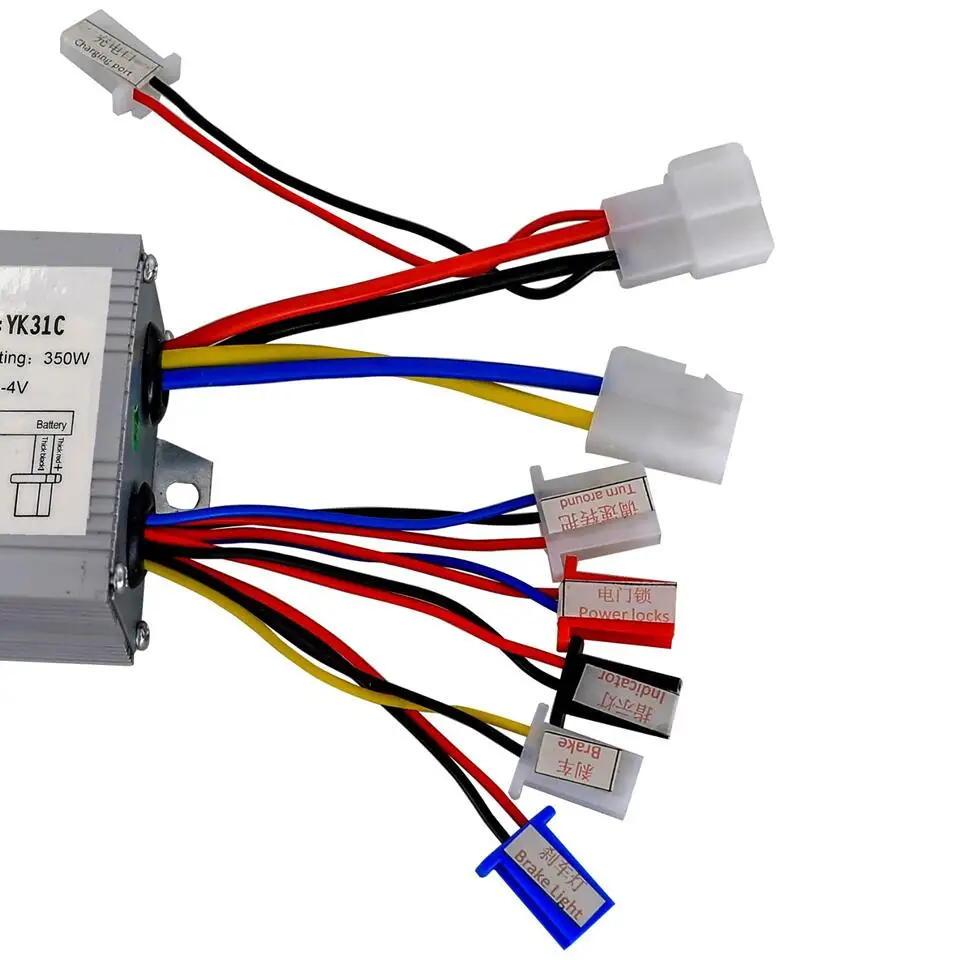 Напряжение Ted: 24 В Номинальная мощность: 500 Вт В соответствии с Напряжение защиты: 20V ± 0,5 V Предел тока: 28 ± 1A Полезный Двигатель: 24V500 Вт Регулятор скорости 1-4 в (дроссельная заслонка) Условия эксплуатации: -25 -- 45 Функция: Этот товар подходит для электрического велосипеда и скутера Контроллер щетки двигателя. Разъем: 1. Красный и черный (большой кабель): подключение батареи 2. Желтый и синий: соединения двигателя 3. Красный и синий: клавишный переключатель (Блокировка питания) (Если нет дверных замков питания, красное соединение с синим) 4. Желтый и черный: тормоз 5. Красный и желтый: тормозной светильник 6. Красный и черный (маленький кабель): световой светильник 7. Красный, черный и синий: регулятор скорости 1-4 в (дроссельная заслонка) (Красный: + 5 В, черный: - , синий: сигнальный провод) 8. Красный и черный (маленький кабель): зарядное устройство