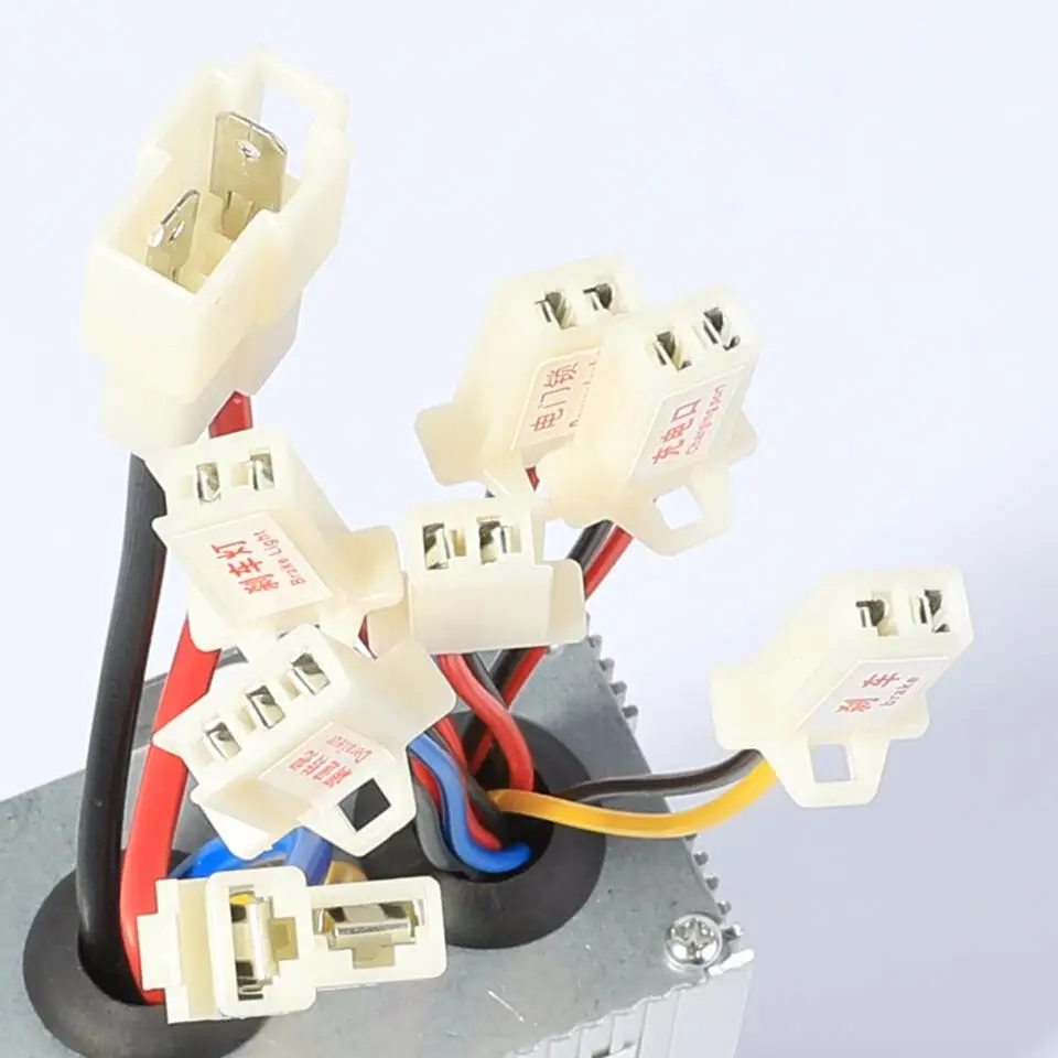 Этот регулятор напряжения 36 имеет 8 разъемов. Номинальное напряжение 36 вольт Номинальный двигатель 350 Вт Номинальный ток 27 ± 1 А Эффективность преобразования 95% В соответствии с Напряжение защита 31,5 ± 0,5 V Интерфейс 1 черный и желтый разъем-тормозной провод 2 порта для зарядки красного и черного цвета 3 красный и черный и синий коннектор-переключатель/дроссельная заслонка 4 красный и черный разъем-индикатор 5 красный и синий разъем-силовые замки 6 красный и черный разъем-тормозной светильник 7 Толстый белый и синий разъем-мотор 8 толстый красный и черный разъем-аккумулятор