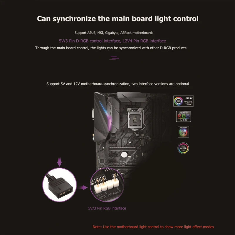 1. Поддержка материнской платы ASUS, MSI, Gigabyte, ASRock 5V/3Pin D-RGB интерфейс управления освещением через управление материнской платой, может синхронизировать освещение с другими продуктами D-RGB.