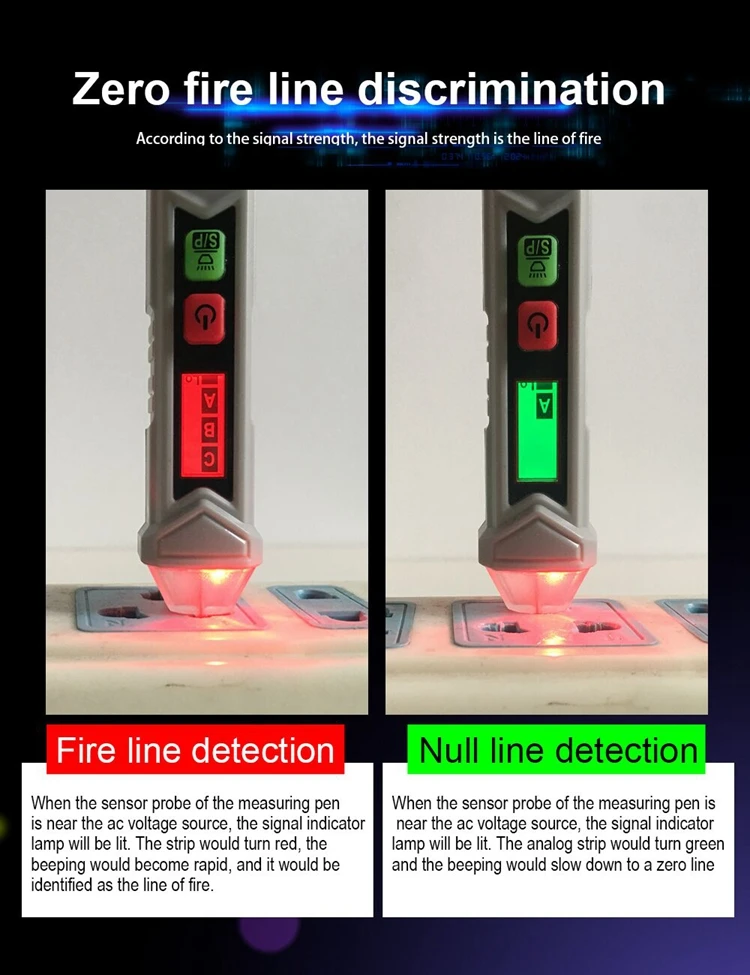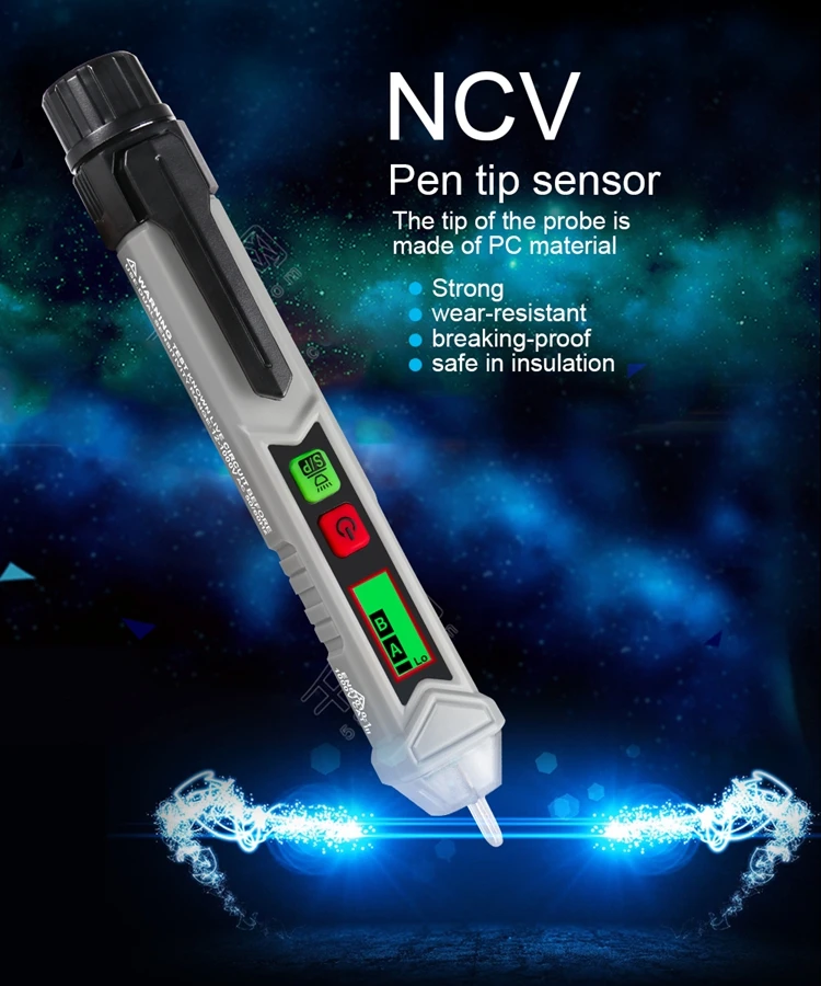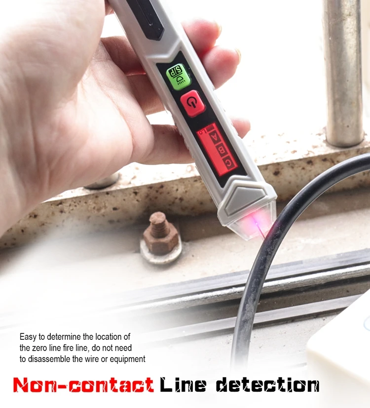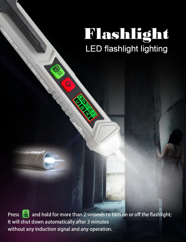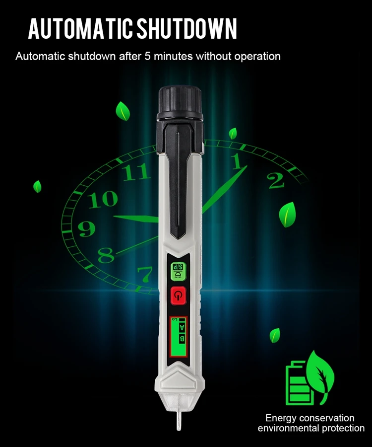 Интервальное определение точки останова. Интеллектуальная идентификация нулевого пожарного провода. Звук и светильник с тройной сигнализацией. Высокая и низкая чувствительность может быть переключена. Измерьте вращение двигателя вперед и назад. Функции: Бесконтактное измерение, фонарик, Автоматическое отключение питания, чередования фаз, низкое напряжение дисплея, 3,0 метров противоударной защитой (ручка). Легко определить расположение пожарной линии нулевой линии, не нужно разбирать провод или оборудование. Точка зонда сделана из поликарбоната, который является прочным, износостойким, непромокаемым и безопасным в изоляции. Автоматическое выключение через 5 минут без работы. Энергосбережение и охрана окружающей среды.