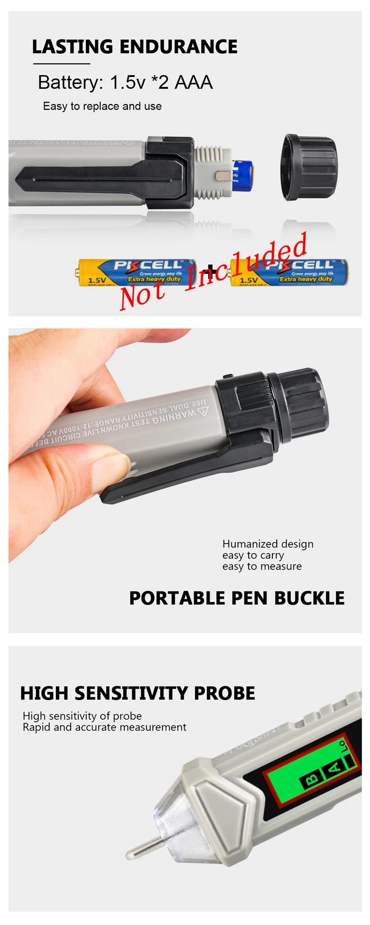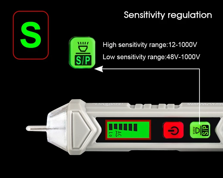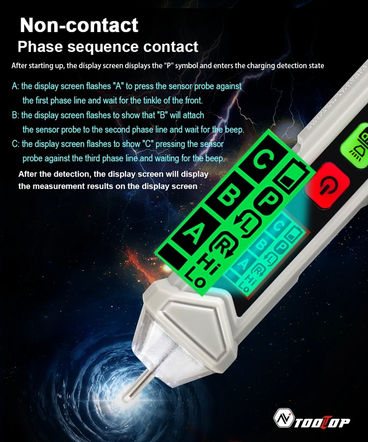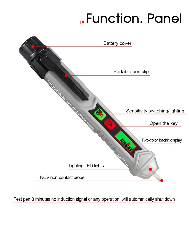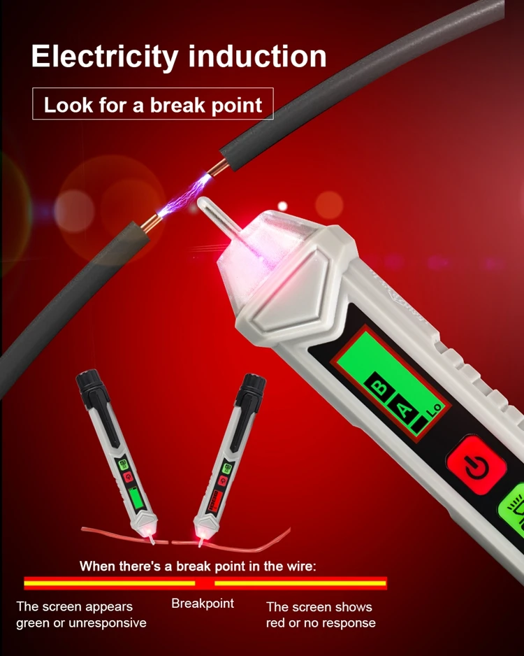 Интервальное определение точки останова. Интеллектуальная идентификация нулевого пожарного провода. Звук и светильник с тройной сигнализацией. Высокая и низкая чувствительность может быть переключена. Измерьте вращение двигателя вперед и назад. Функции: Бесконтактное измерение, фонарик, Автоматическое отключение питания, чередования фаз, низкое напряжение дисплея, 3,0 метров противоударной защитой (ручка). Легко определить расположение пожарной линии нулевой линии, не нужно разбирать провод или оборудование. Точка зонда сделана из поликарбоната, который является прочным, износостойким, непромокаемым и безопасным в изоляции. Автоматическое выключение через 5 минут без работы. Энергосбережение и охрана окружающей среды.