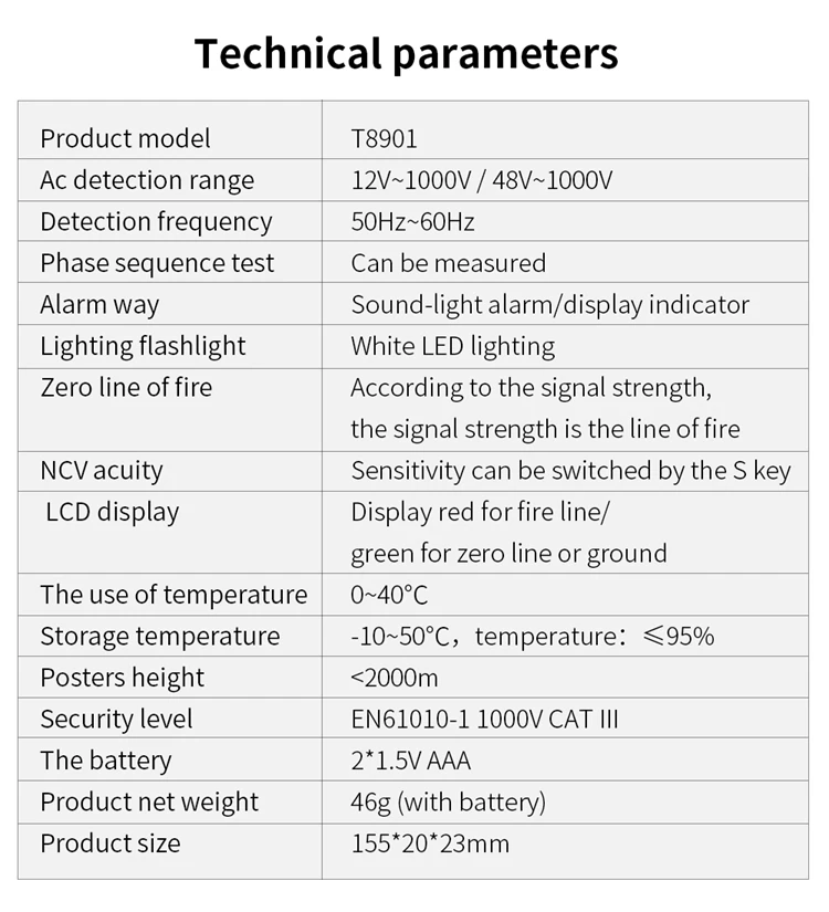 Материал: АБС-пластик + Поликарбонат Основной цвет: серый Модель: T8901 Диапазон обнаружения переменного тока: 12 В-1000 В/48 В-1000 В Частота обнаружения: 50 Гц-60 Гц Проверка последовательности фаз: может быть измерена Способ сигнализации: звуковой светильник/индикатор отображения Фонарик: Белый светодиодный Нулевая линия огня: в соответствии с силой сигнала сила сигнала-это линия огня Acuity NCV: Чувствительность может быть переключена с помощью S ключа ЖК-дисплей: Красный дисплей для пожарной линии/зеленый для нулевой линии или земли Рабочая температура: 0-40 ℃ Температура хранения: -10-50 ℃, влажность: ≤ 95% Высота высоты: <2000 м Батарея: 2 аккумулятора * AAA батарея (не входит в комплект) Размер изделия: 155*23*20 мм/6,1*0,9 * 0.8in Вес товара: 46 г/1,6 унции Размер посылка: 160*25*22 мм/6,3*1,0 * 0.9in Посылка Вес: 52 г/1,8 унция