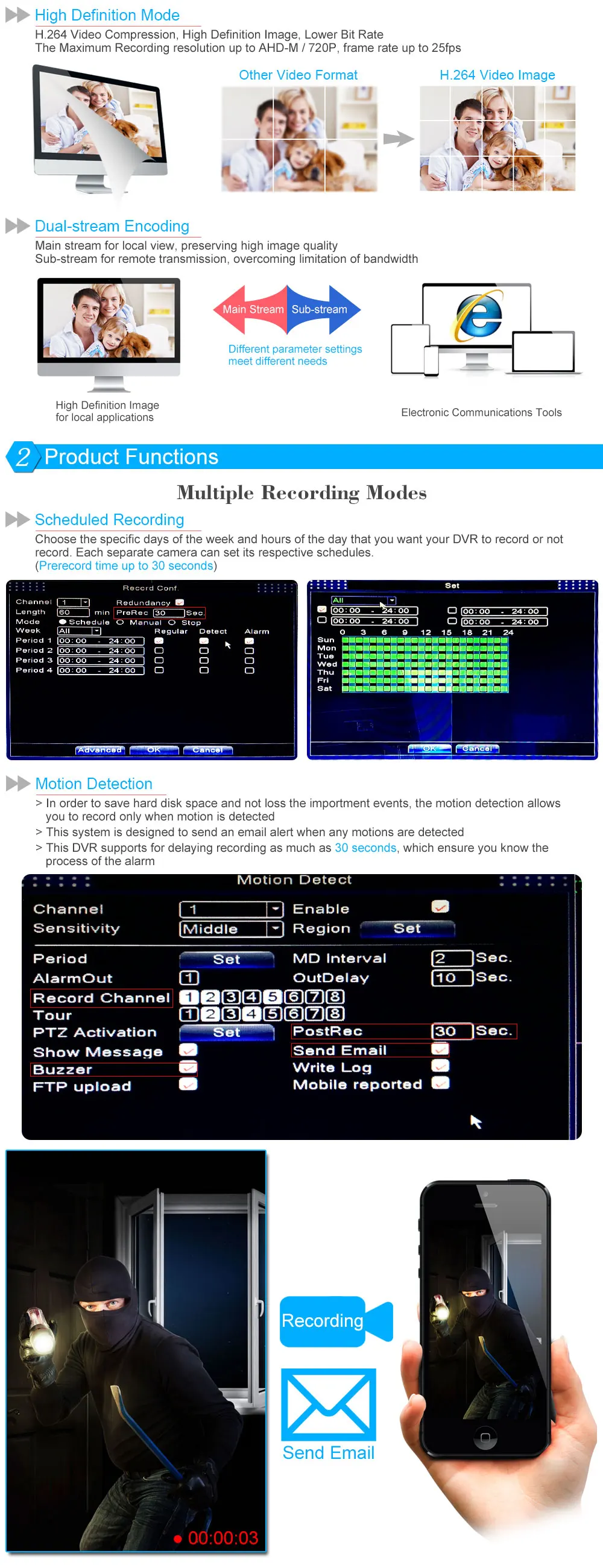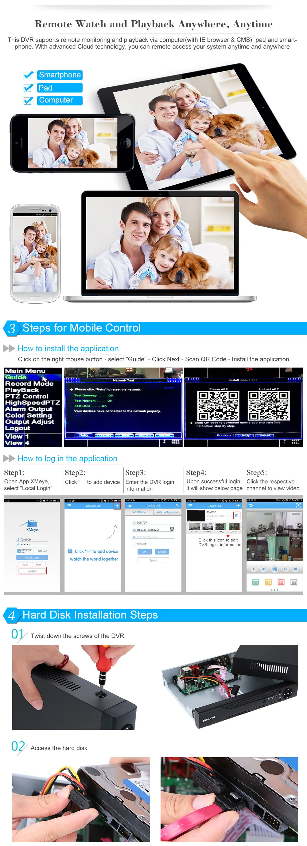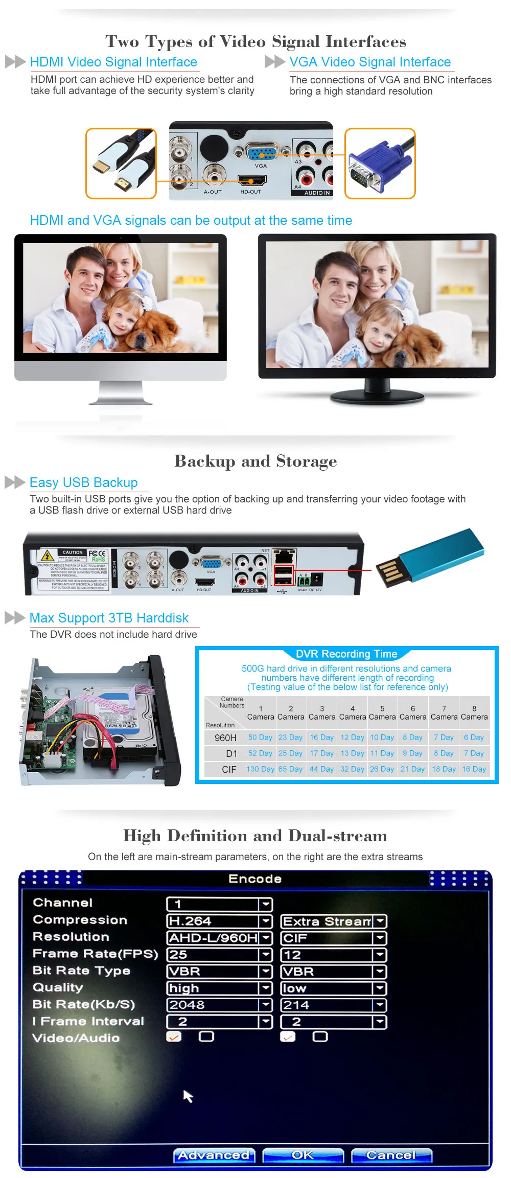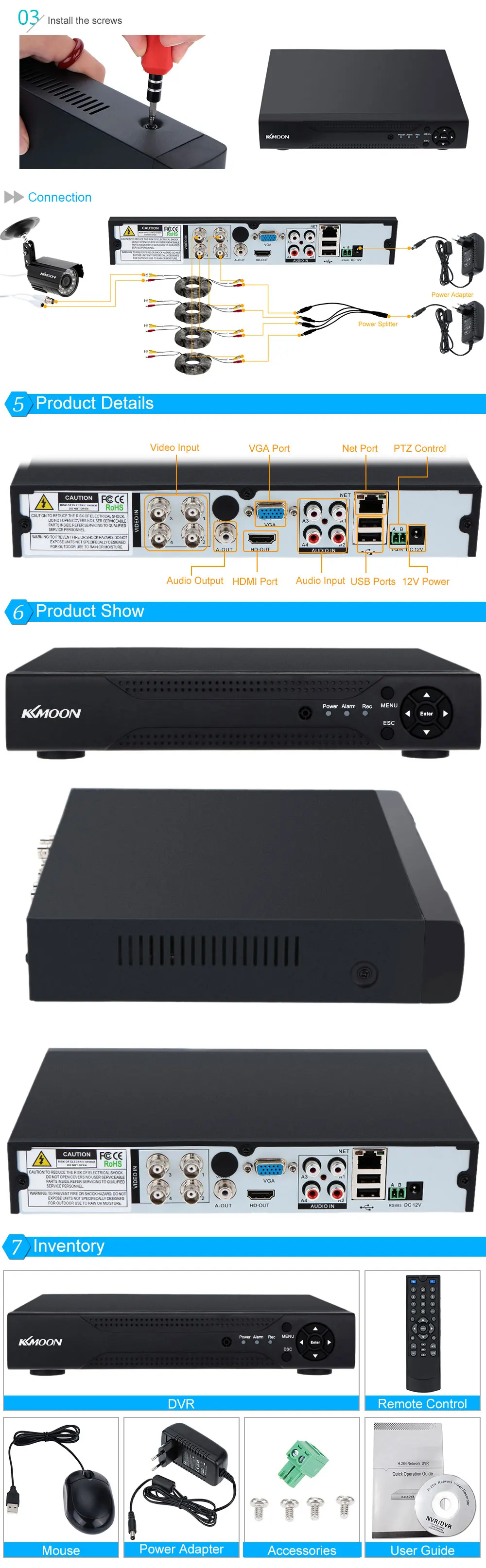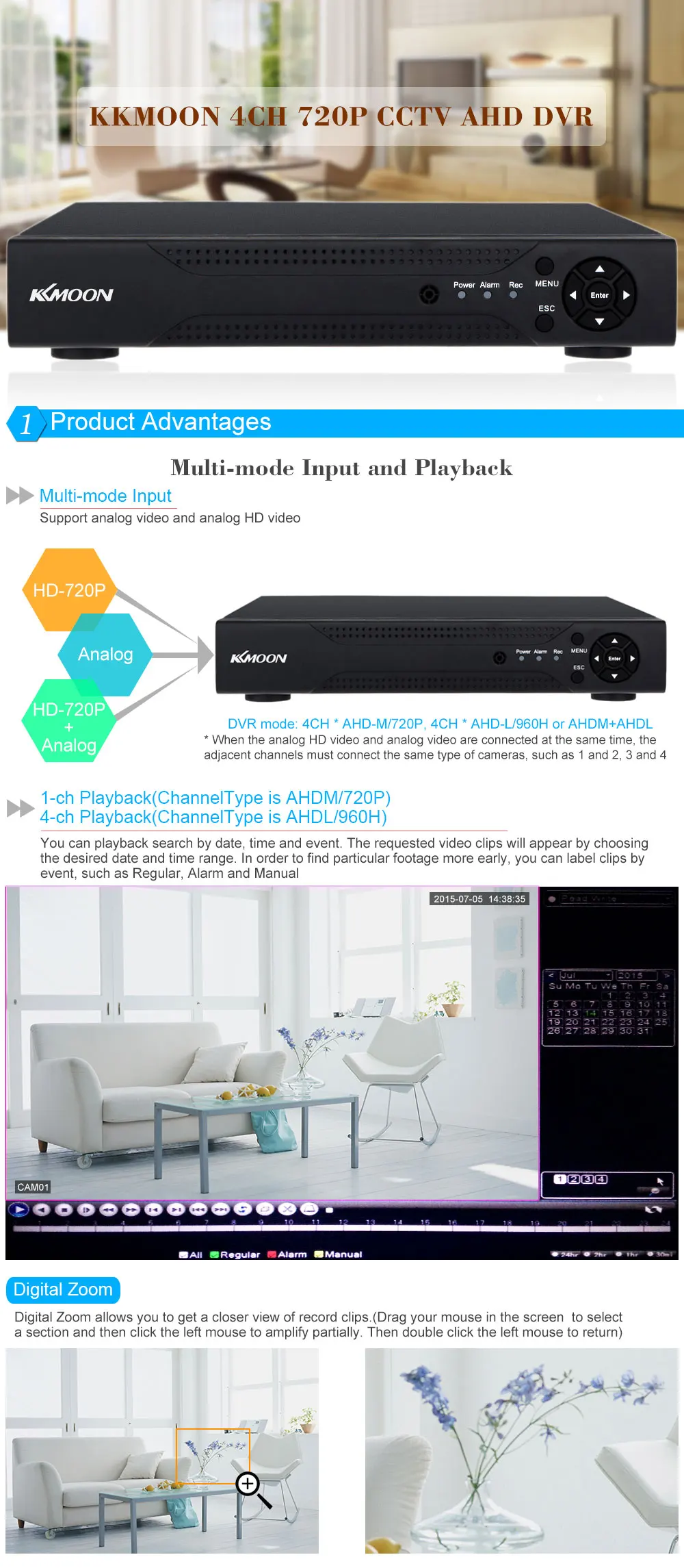 Примечание: Этот видеорегистратор не включает в себя какие-3,5 "HDD. Обзор: Наша домашняя система безопасности DVR имеет много применений: обнаружение безопасности в общественных местах, мониторинг для магазинов без присмотра и защиты складов, парки и аттракционы записи безопасности и наблюдения, мониторинг безопасности для дач и жилых районов, а также другие потребности в наблюдении для наружного/внутреннего. Этот AHD DVR сочетает в себе функцию DVR/HVR/NVR, поддерживает 4-канальное воспроизведение (ChannelType is AHDL/960H) и многорежимный вход, включая HD-720P, аналоговый, HD-720P + аналоговый, которые обеспечивают широкий выбор для мониторинга безопасности и обеспечивают более безопасную систему мониторинга. В то же время этот AHD DVR обеспечивает лучший опыт независимо от того цифровой зум, который позволяет форм, и мы подарим Вам ближе вид записи зажимы, максимальная поддержка 3 ТБ 3,5 "жесткого диска (жесткий диск не входит в комплект). Наконец, вы можете выбрать запланированную запись, установить Обнаружение движения или смотреть видео на вашем компьютере и телефоне. Простая установка, простота в эксплуатации.