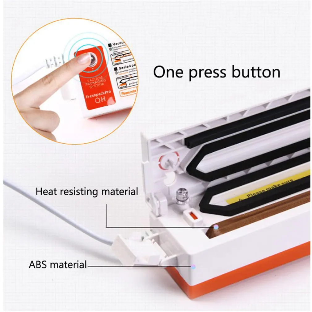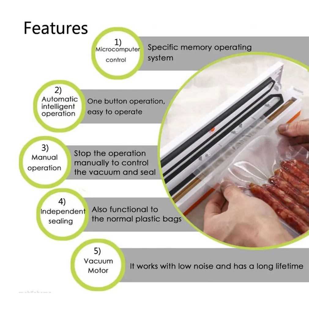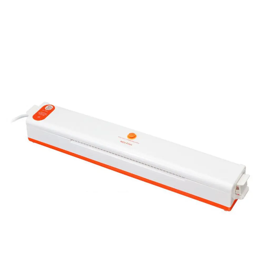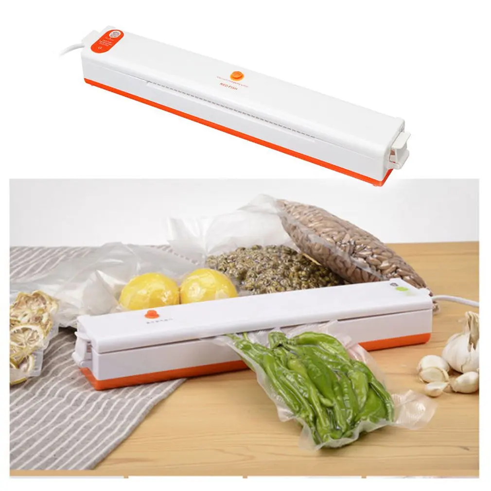 Особенности: 1. Рулонный отсек для хранения с ножом для резки мешков, который можно разрезать по мере необходимости. 2. Новая технология, сокращает использование мешков, на 50% меньше, чем традиционное устройство для экономии пищи. 3. Легко фиксируемый пакет с защелкой для надежного вакуумного уплотнения. Продлите время свежести пищи в 5 раз. 4. Кнопка автоматического вакуумирования и герметизации-кнопка двойного назначения может удалять воздух и создавать прочное уплотнение. Как только еда будет запечатана и готова к хранению, она автоматически остановится. 5. Компактный и портативный: компактный и легкий, этот продукт не занимает много места и его можно легко убрать. Описание: Извлеките весь воздух из пакета для хранения продуктов и закройте отверстие, чтобы ингредиенты полностью не попадали в организм от неприятных насекомых и бактерий. Характеристики: Тип: ЕС, США (необязательно) Цвет: оранжево-красный Размер: 34,5x5,5x5 см Напряжение: 110-220 В Посылка 1 * вакуумный упаковщик 10 * сумки 1 шнур питания 1 * Руководство пользователя на английском языке