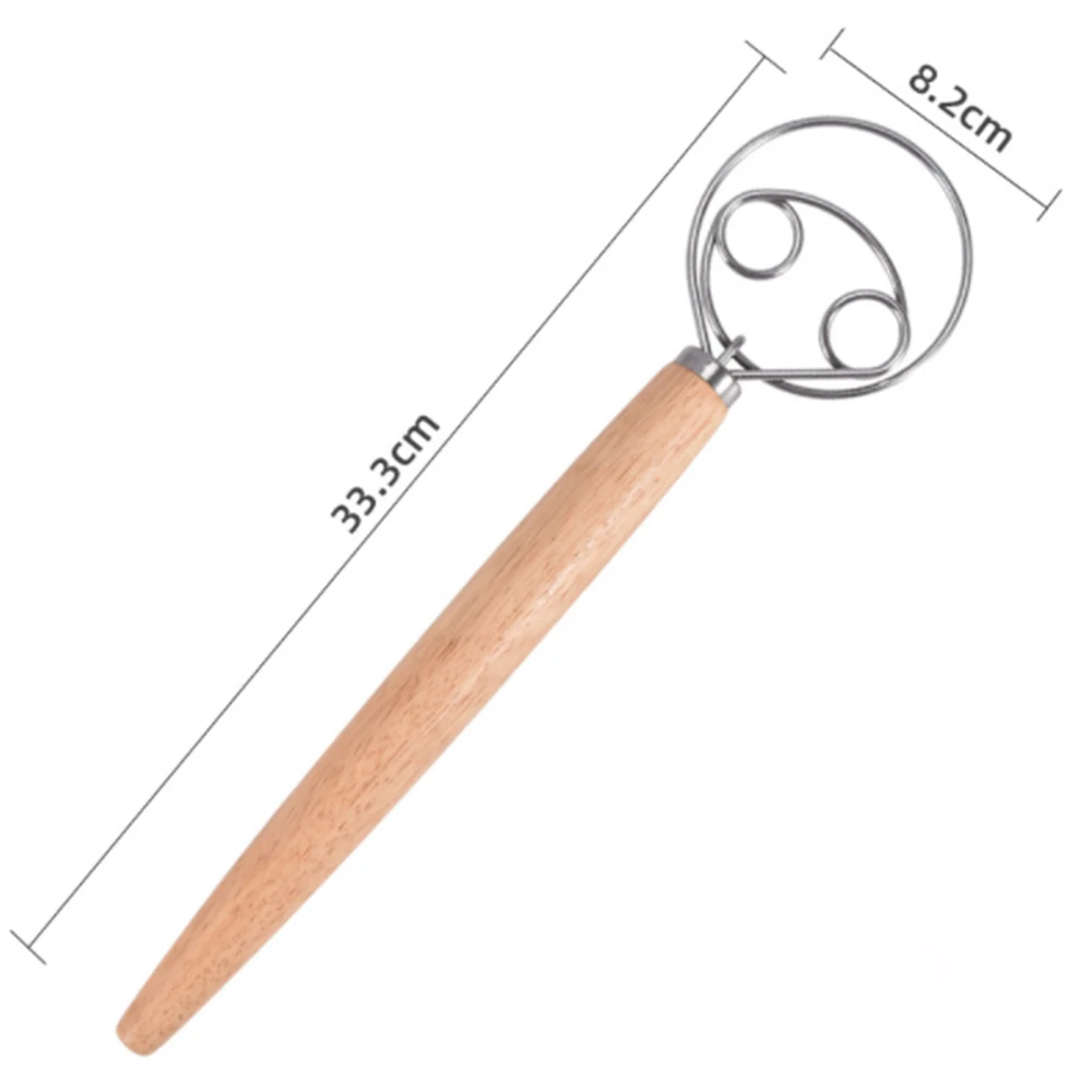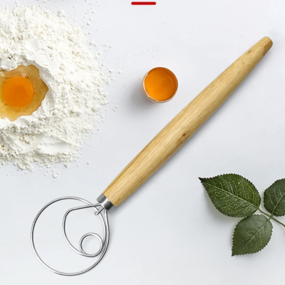 This dough whisk has high grade stainless steel and a sturdy wooden handle.