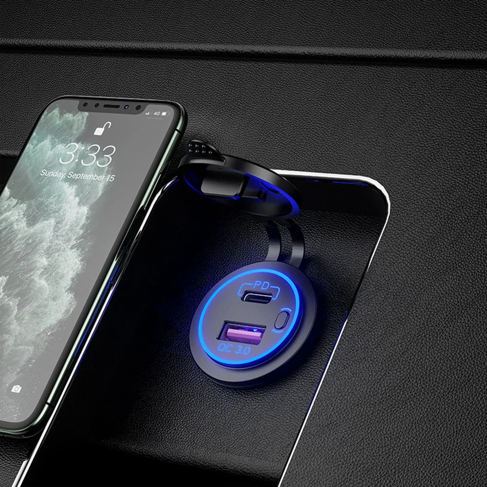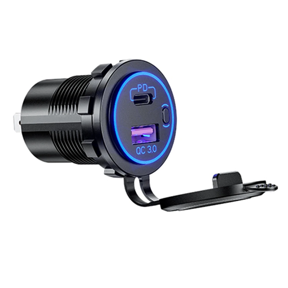 С включенным выключателем, простой в использовании и экономии энергии, изготовлен из передовых материалов ABS с IP66 уплотнением, может заряжать USB C и USB телефоны и планшеты GPS и другие устройства.