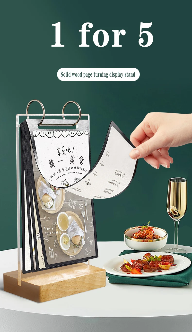 Название продукта: акриловая витрина из цельного дерева, откидная доска, страница деятельности, логотип отеля, заказ еды, рекламные принадлежности, обеденное меню
